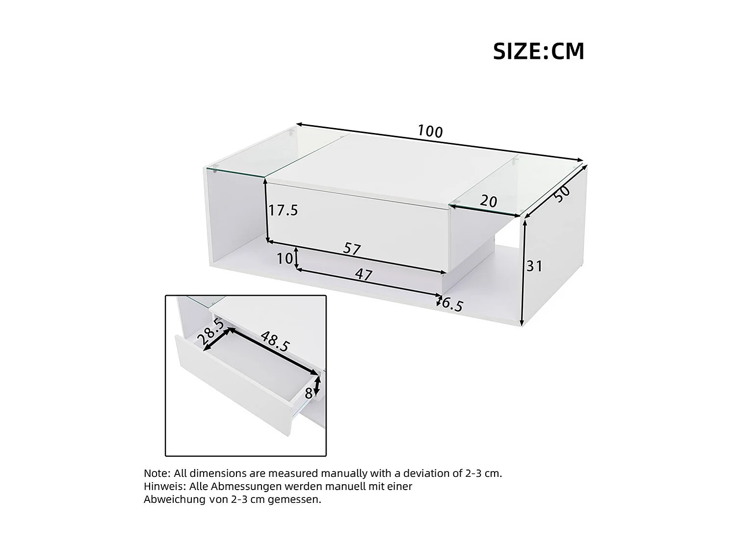 Table basse rectangle 100x50x35.5cm avec 2 tiroirs latéraux et plateau en verre, LED, blanc