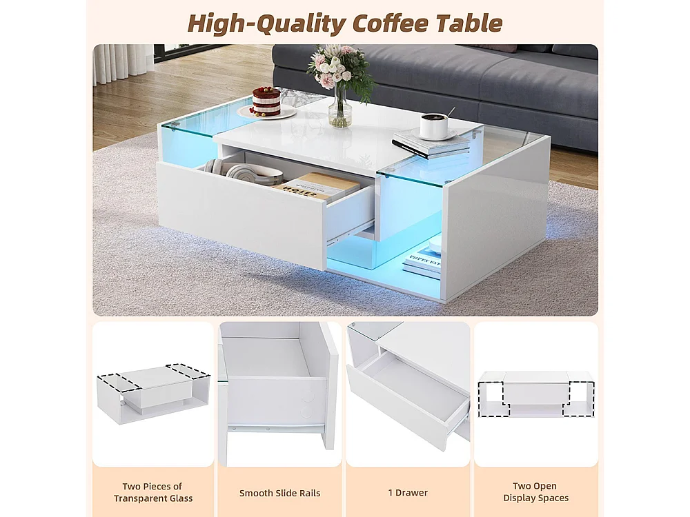 Table basse moderne avec tiroir et compartiments de rangement,LED, blanc laqué