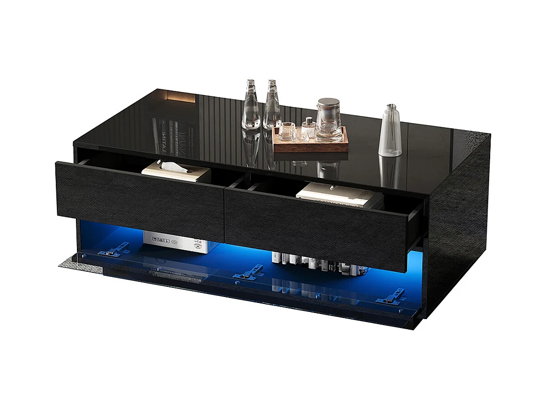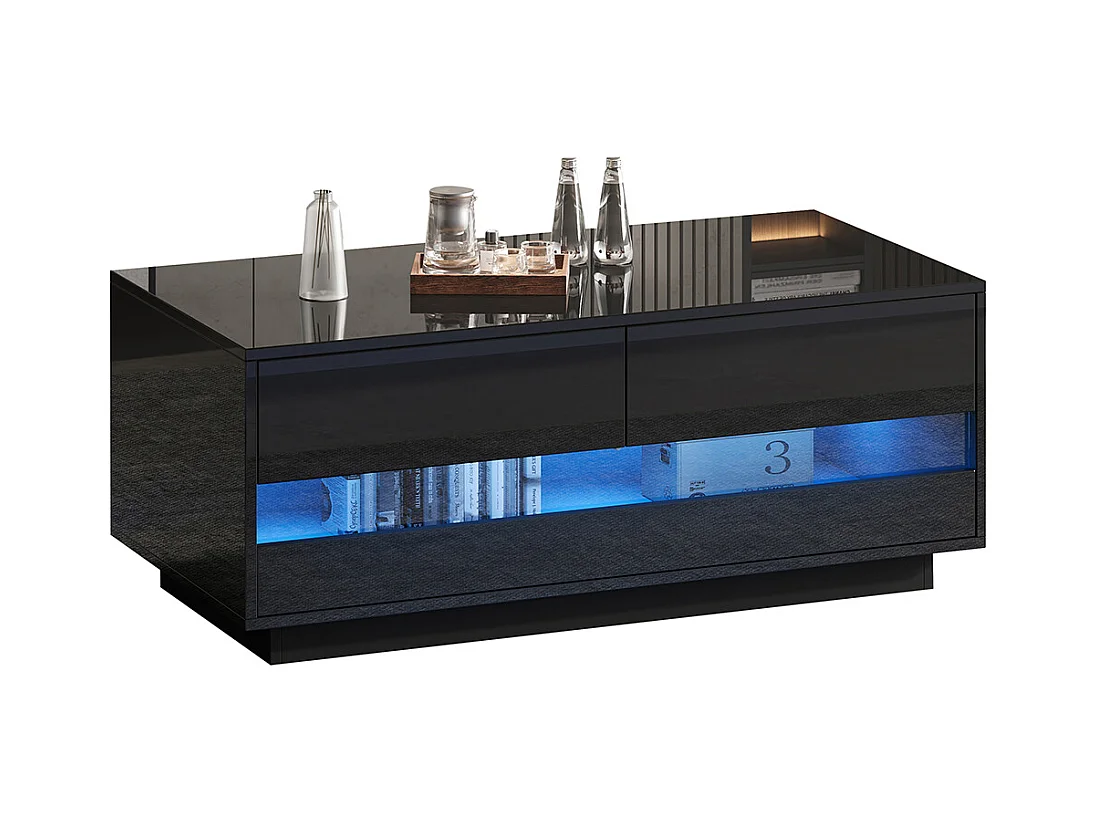 Table basse LED moderne noir brillant 2 tiroirs éclairage LED plateau acrylique MDF salon chambre