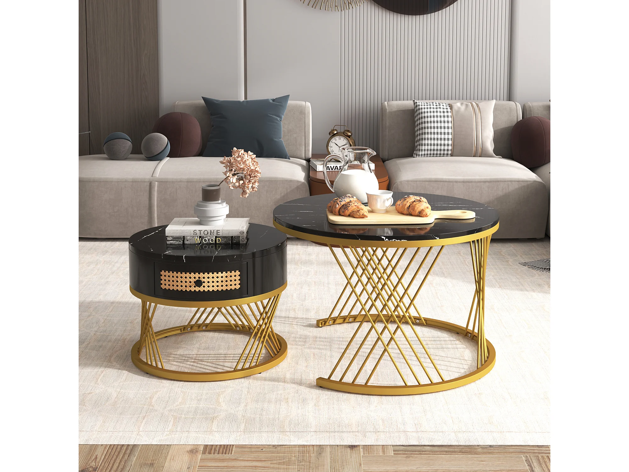 Table basse 2-en-1 avec plateau en marbre et tiroirs en rotin plastique, pieds en métal doré, MDF, noir et or (70x70x45.5+50x50x38.5 cm)