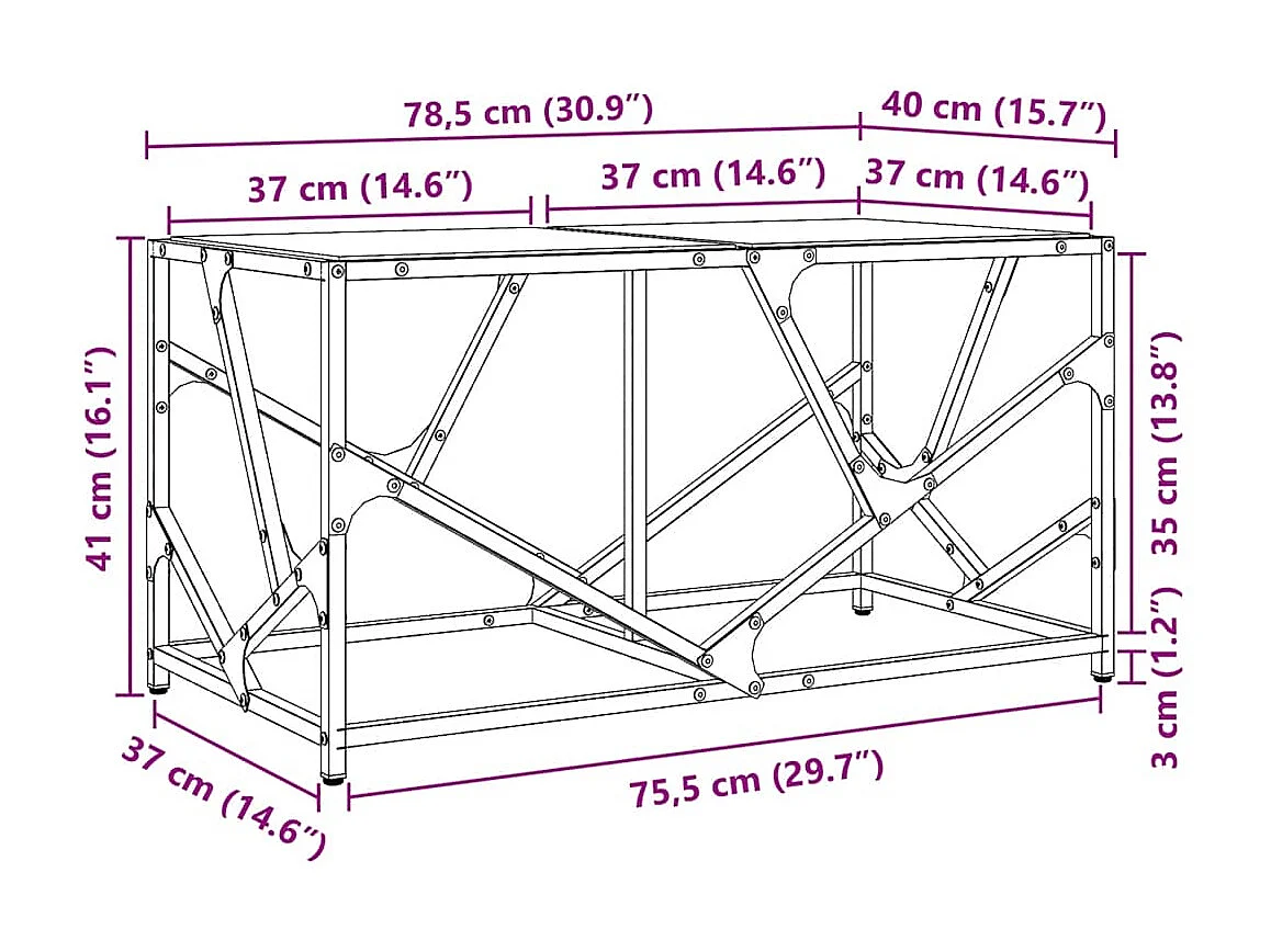 Table basse avec dessus en verre noir 78,5x40x45 cm acier