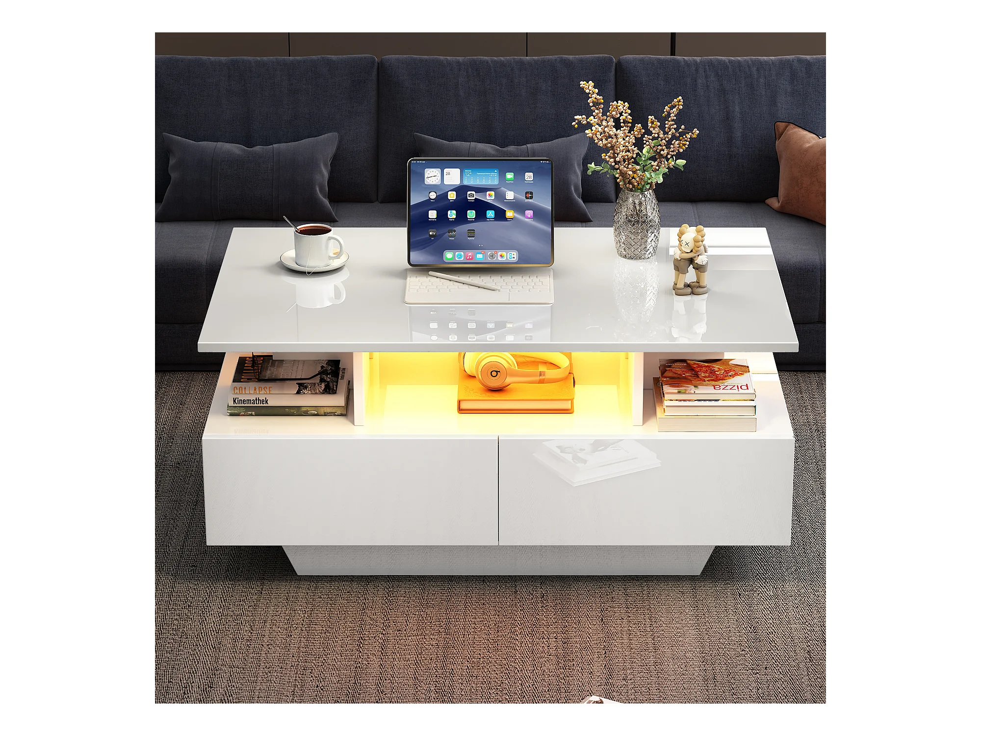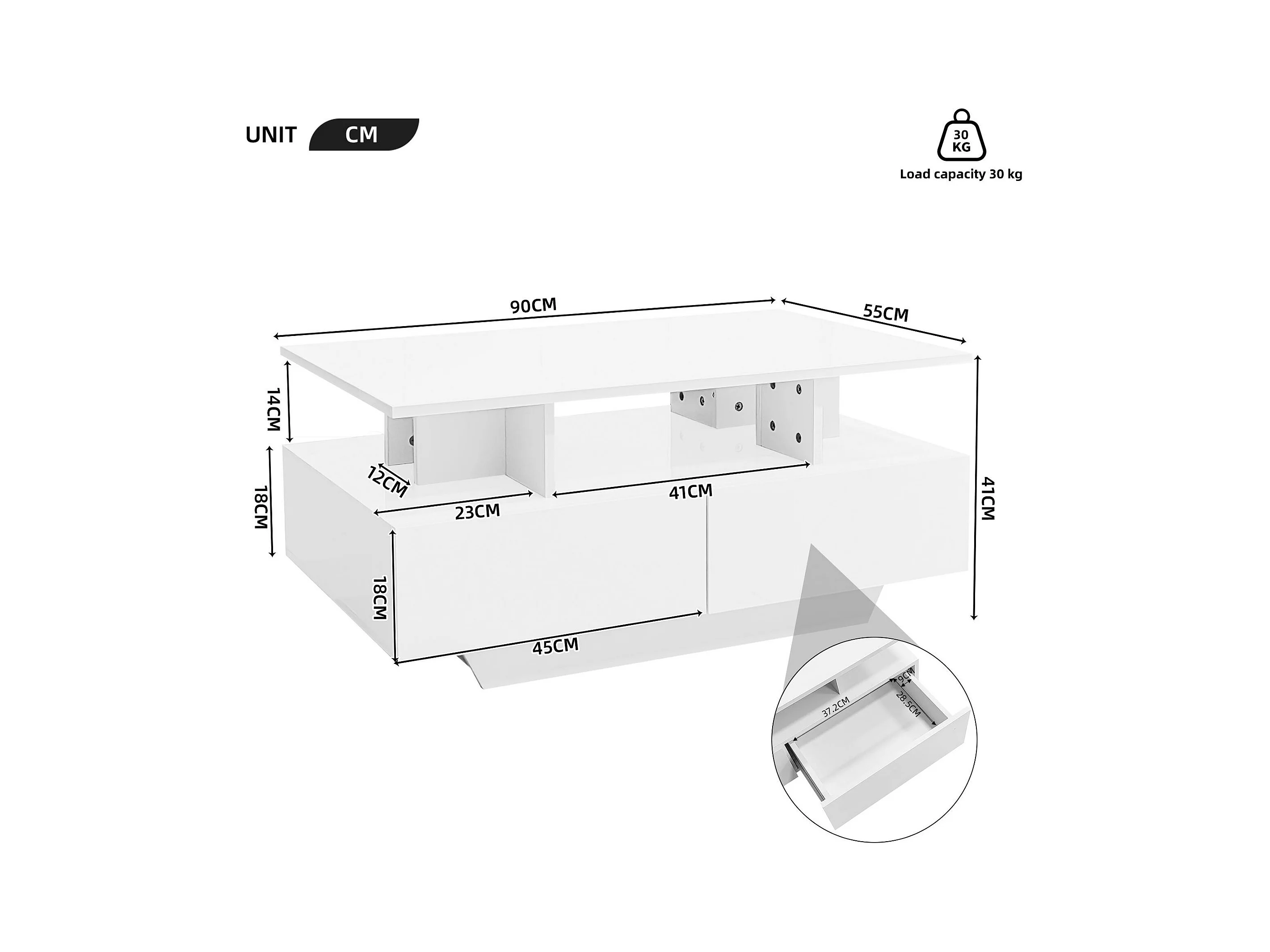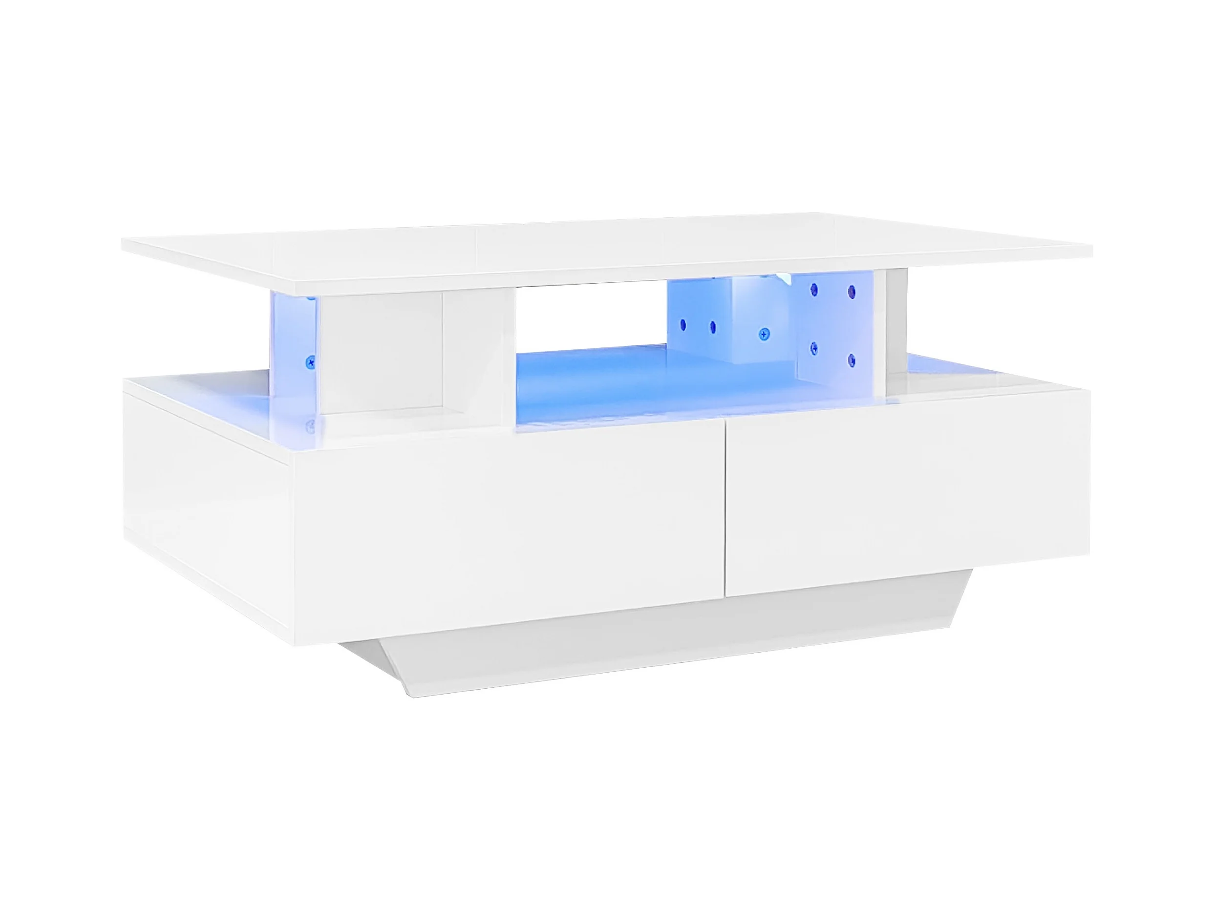Table basse avec 2 tiroirs et compartiment ouvert - 90 x 55 x 41 cm - LEDs - Panneaux de particules - Blanc brillant