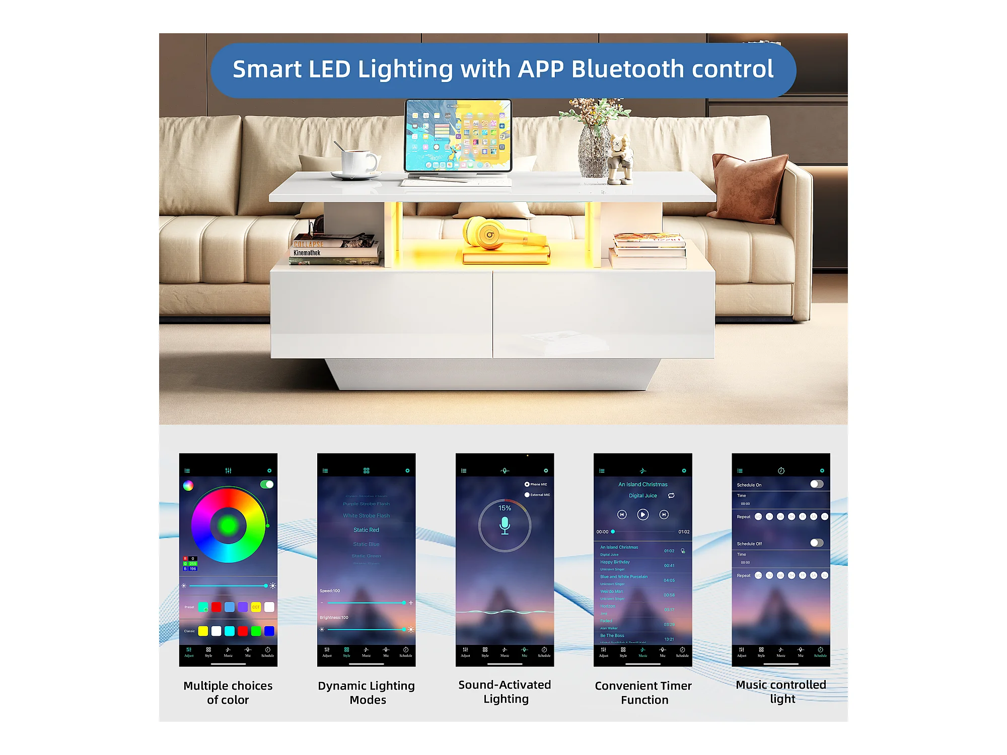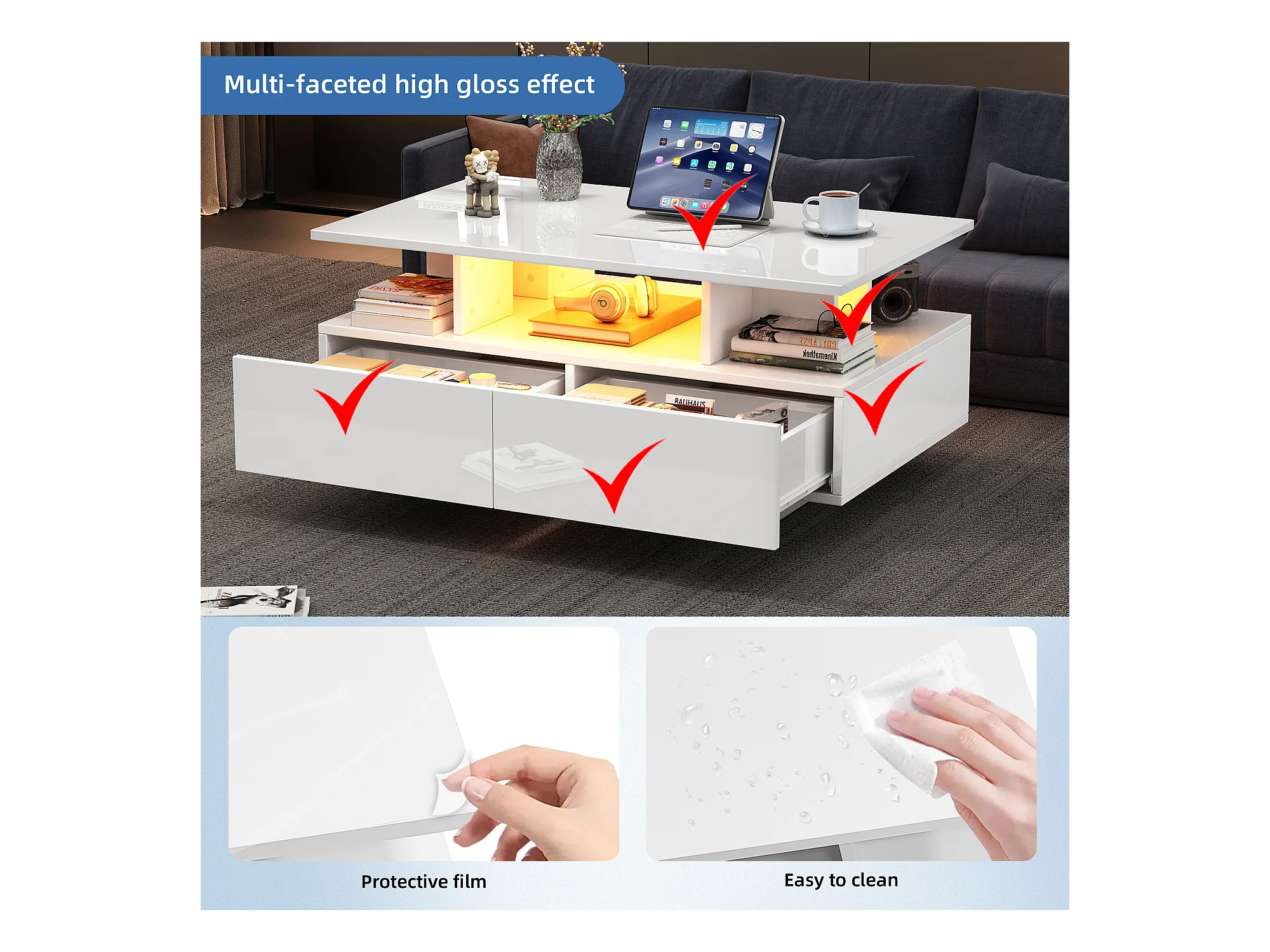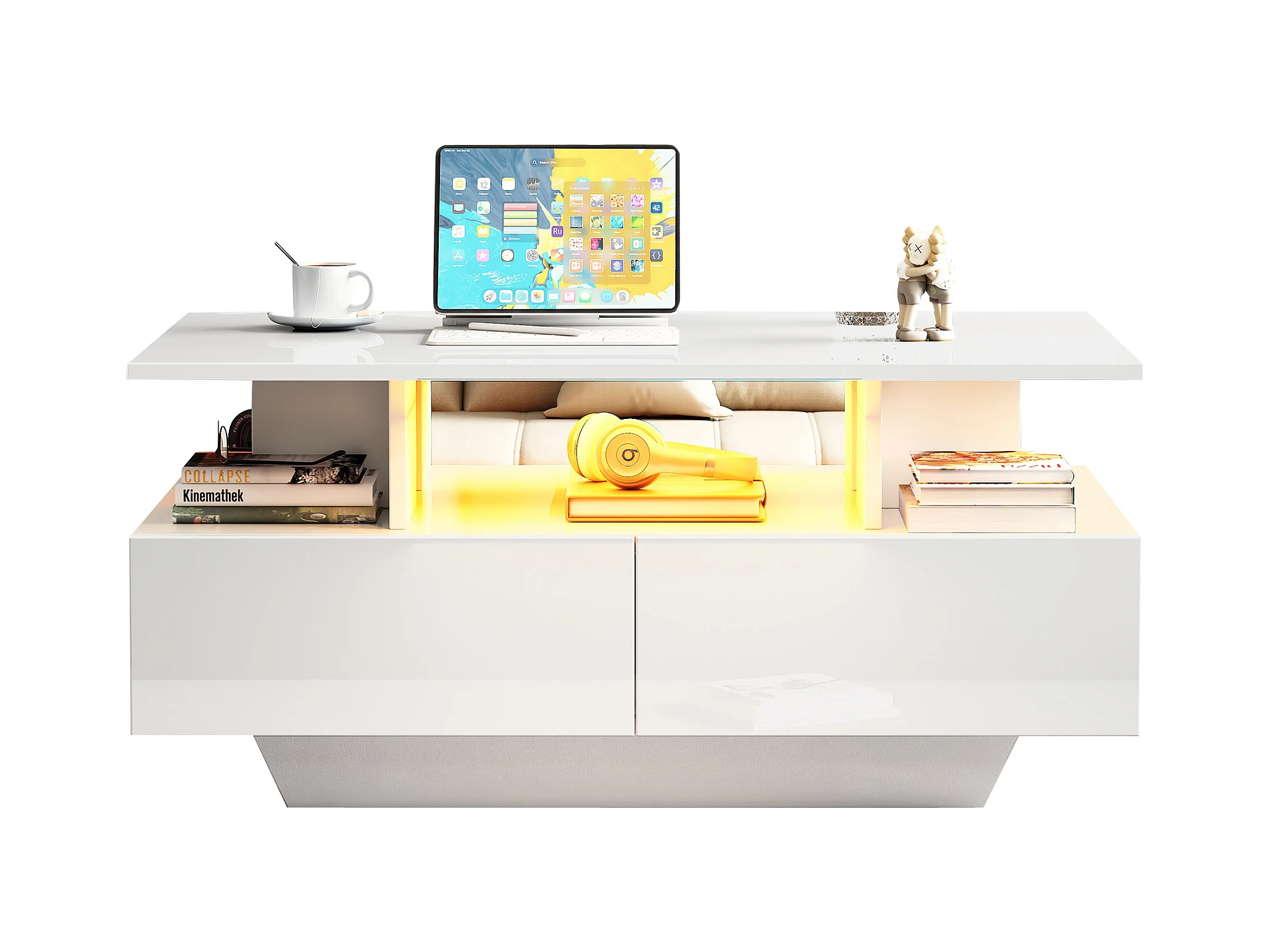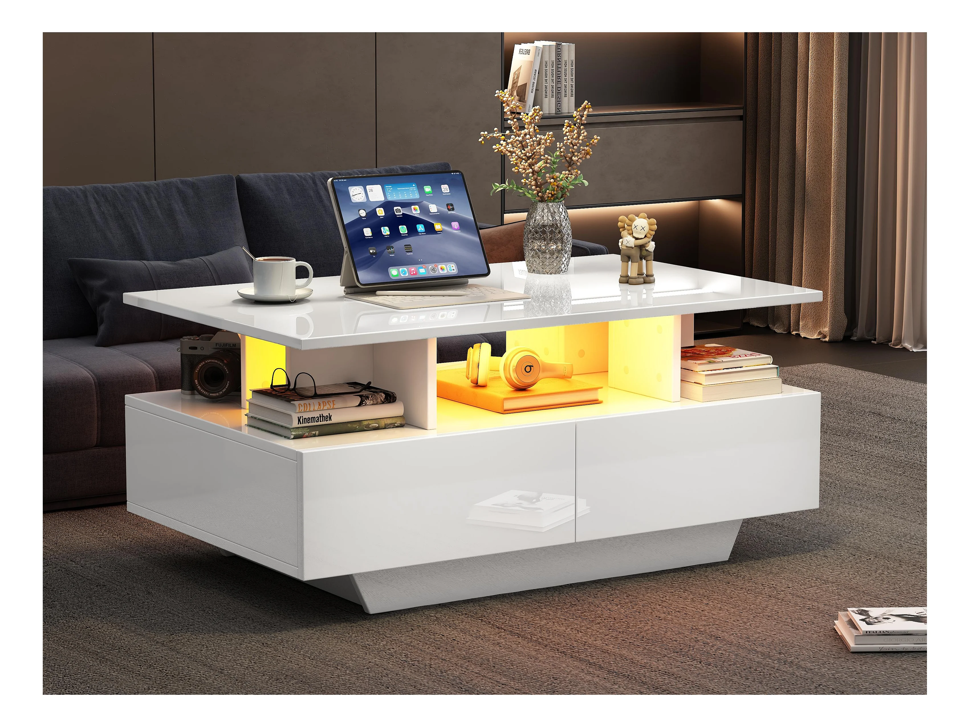 Table basse avec 2 tiroirs et compartiment ouvert - 90 x 55 x 41 cm - LEDs - Panneaux de particules - Blanc brillant