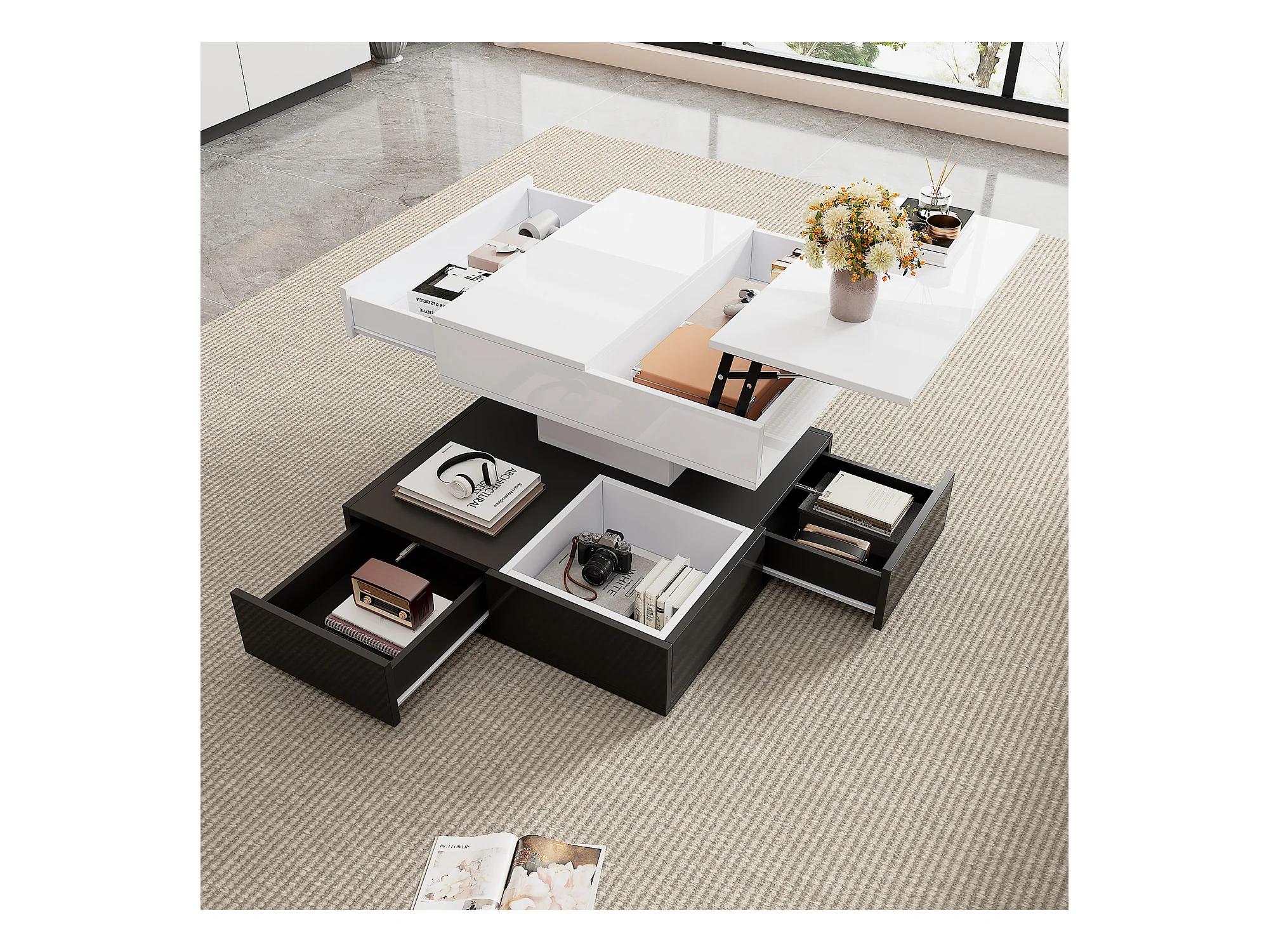 Table basse relevable noire et blanche avec 3 tiroirs, plateau blanc rotatif 83x70x40cm