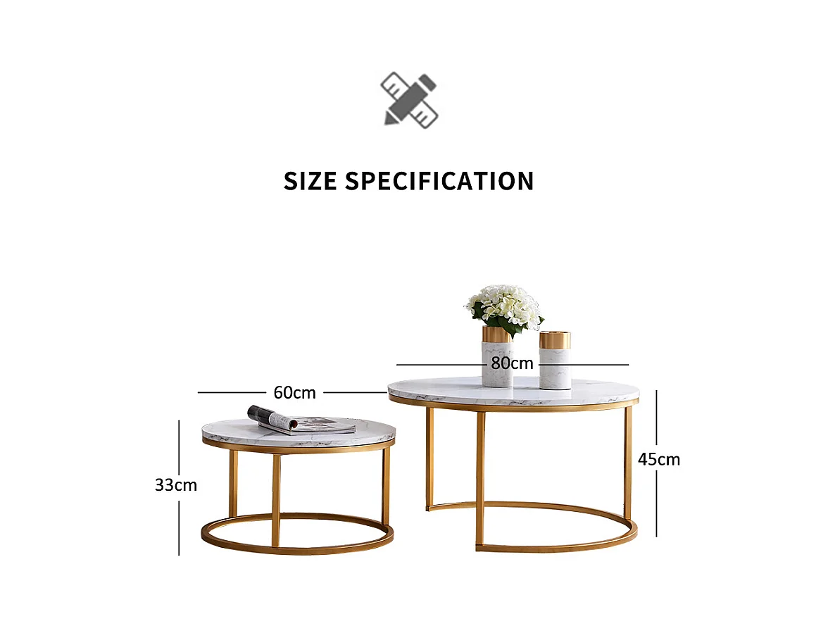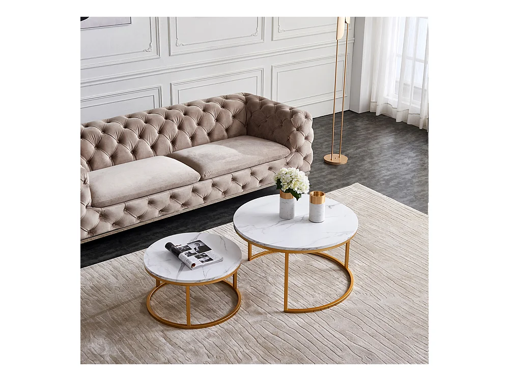 Lot de 2 tables basses - Table basse gigognes ronde - structure en métal doré - sticker aspect marbre