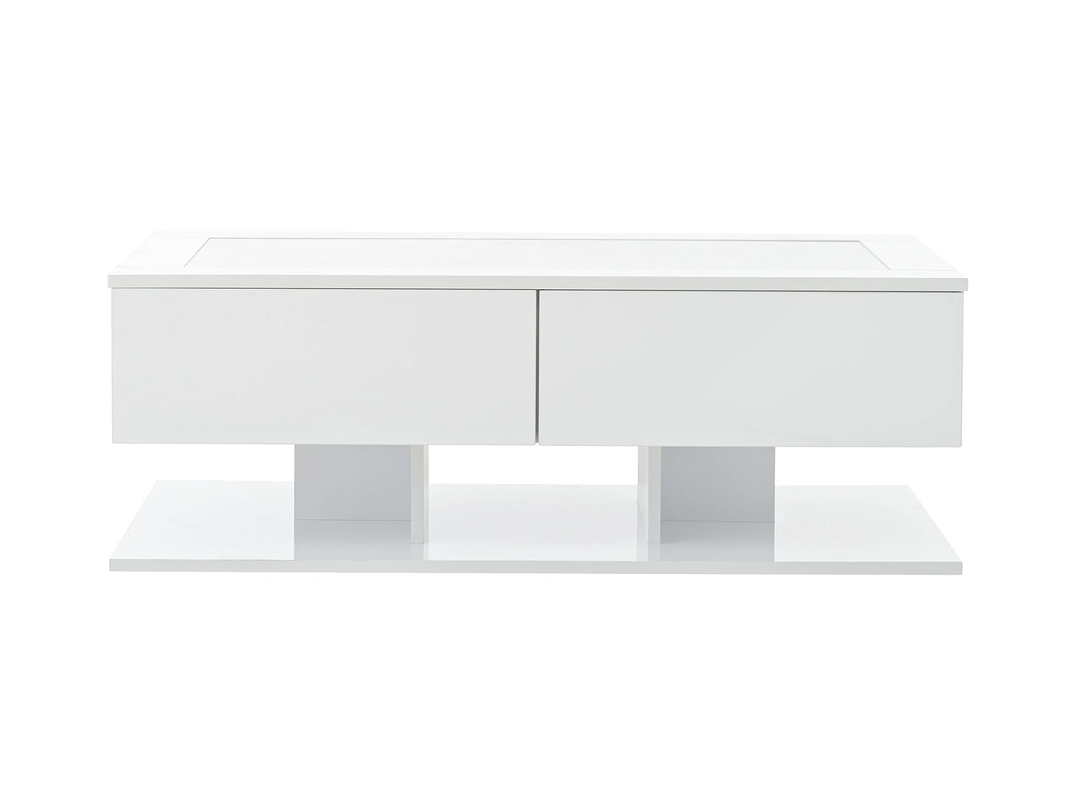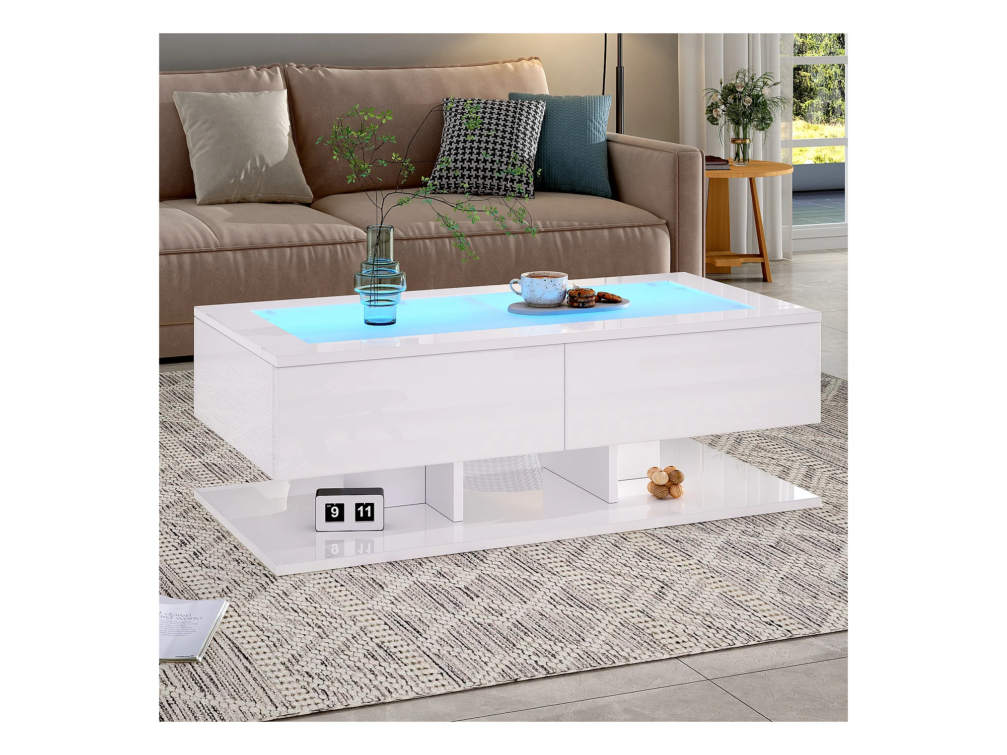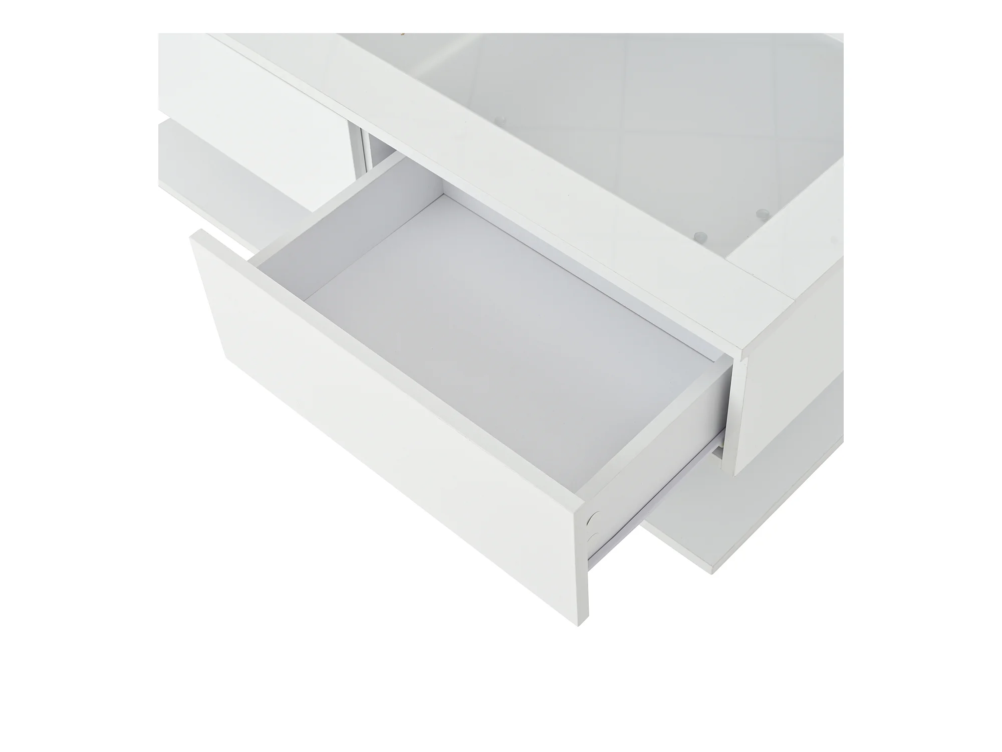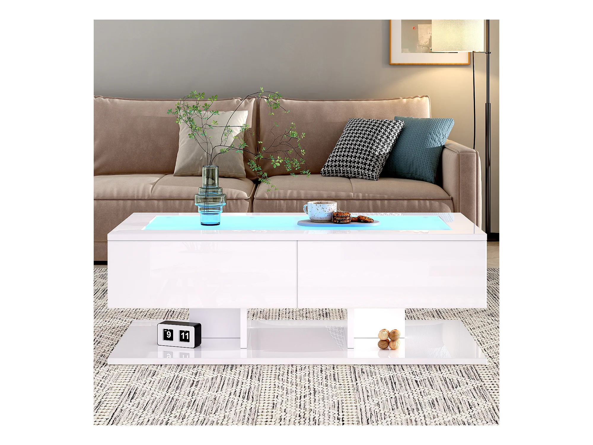 Table basse brillante blanche avec 2 tiroirs de rangement et éclairage LED – pour salon