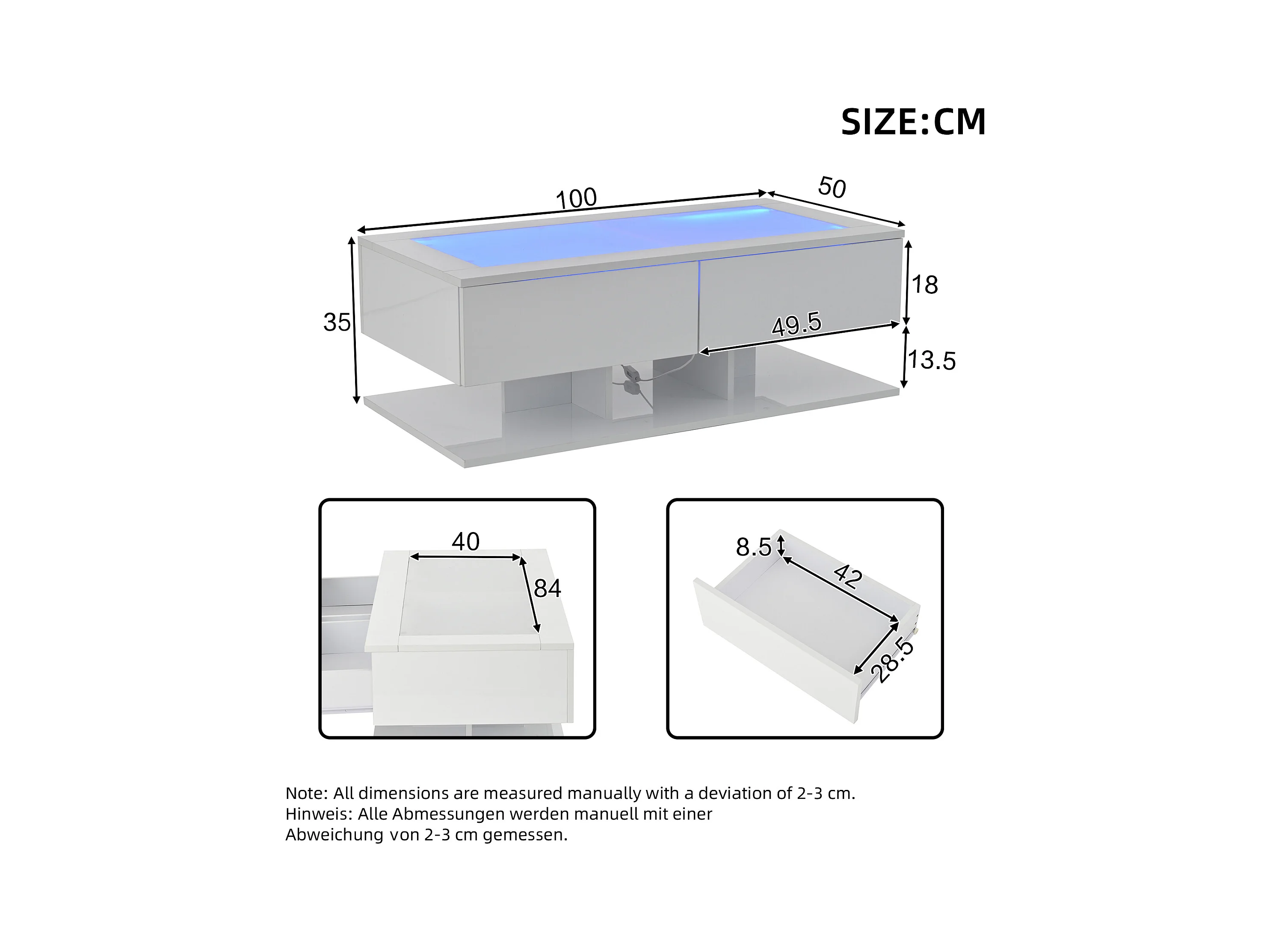 Table basse 100x50x38.5cm Avec lumière LED avec tiroir Espace de rangement Matériel Panneau de particules Blanc pour salon