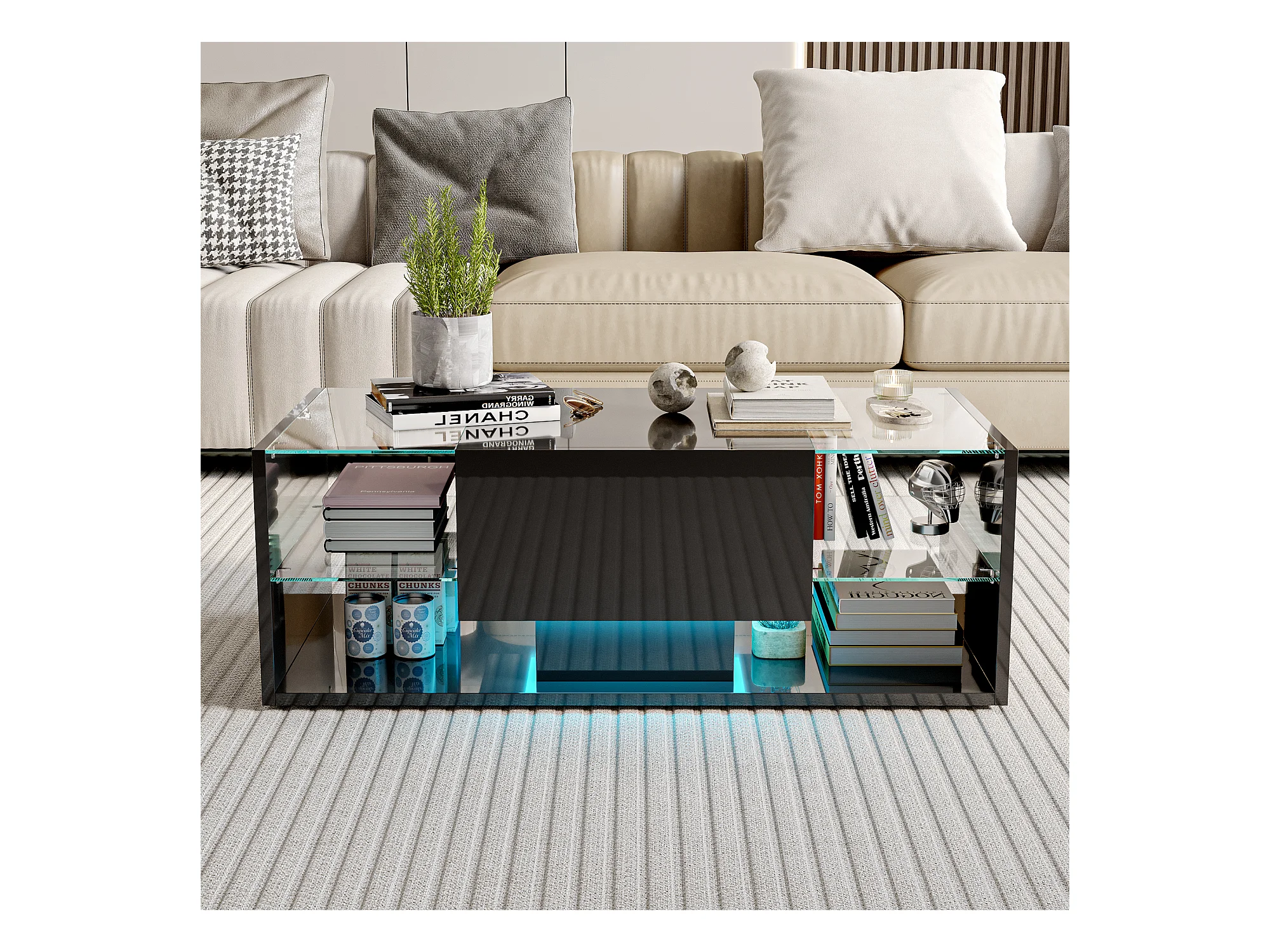 Table Basse Brillante à LED - Étagères en Verre et Tiroir de Rangement, Table de Salon Moderne, pour Salon/Chambre à Coucher - Noir