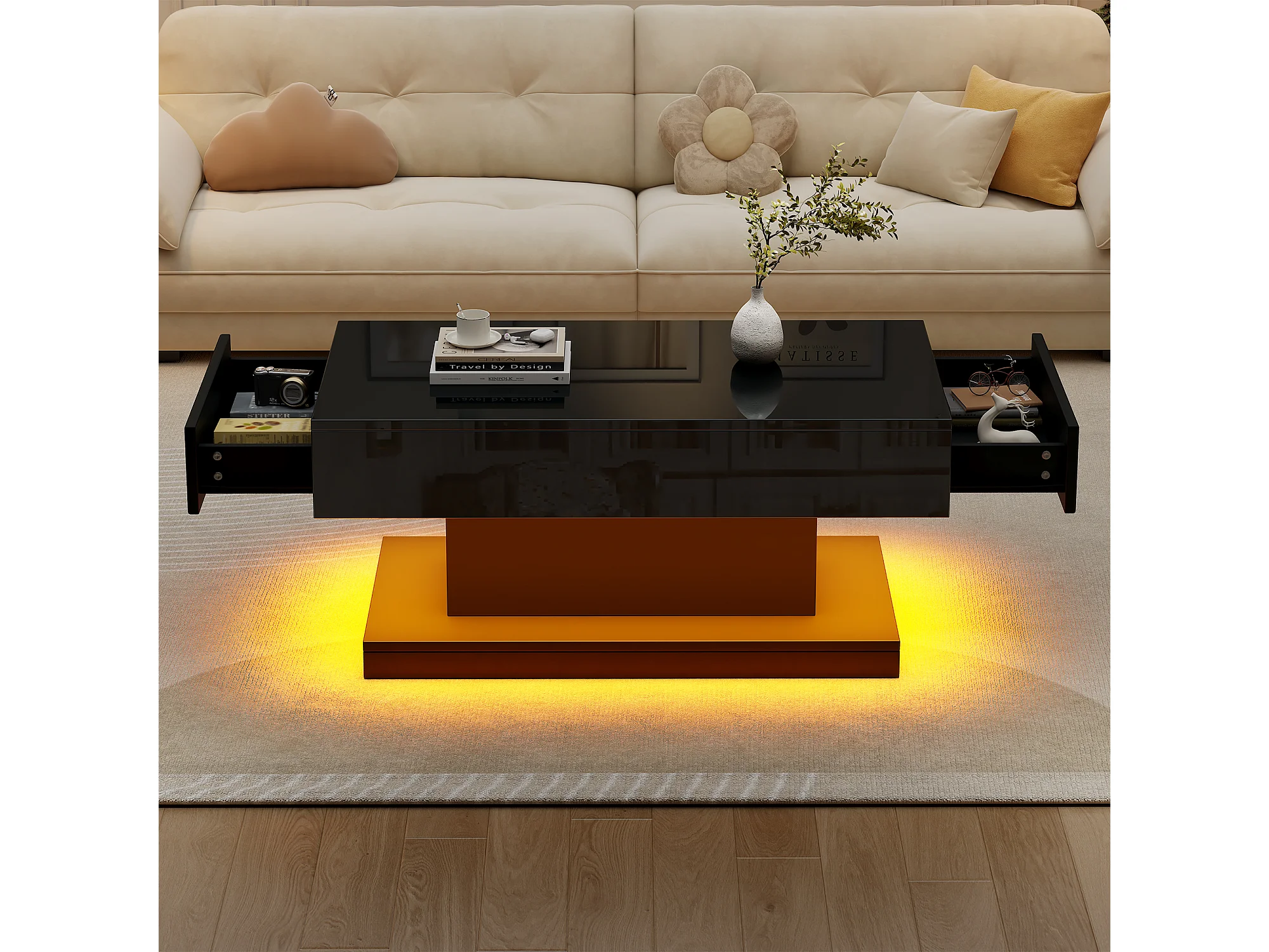 Table basse brillante de salon avec 2 tiroirs + Leds - 100 x 50 x 45 cm - aggloméré - noir