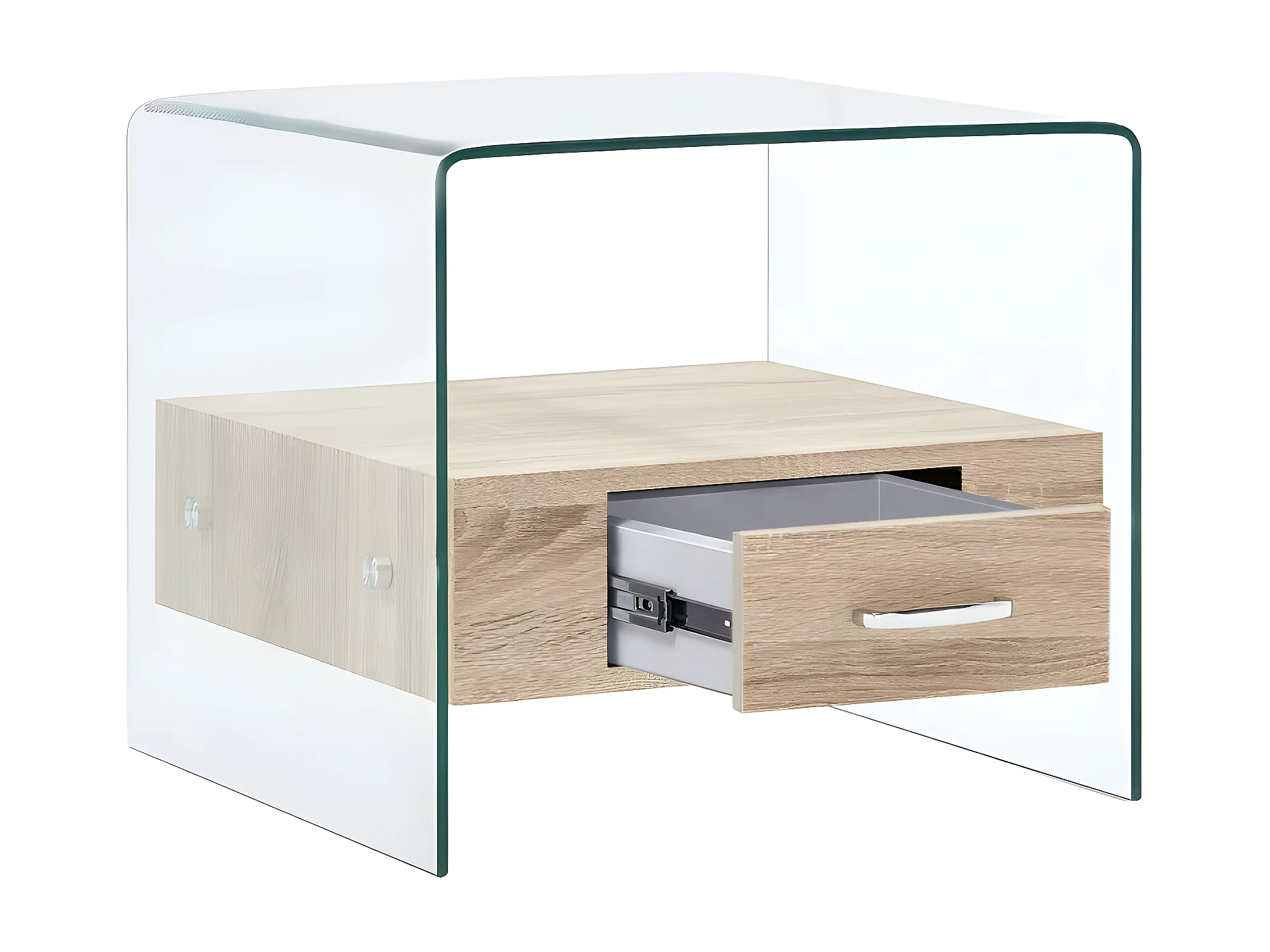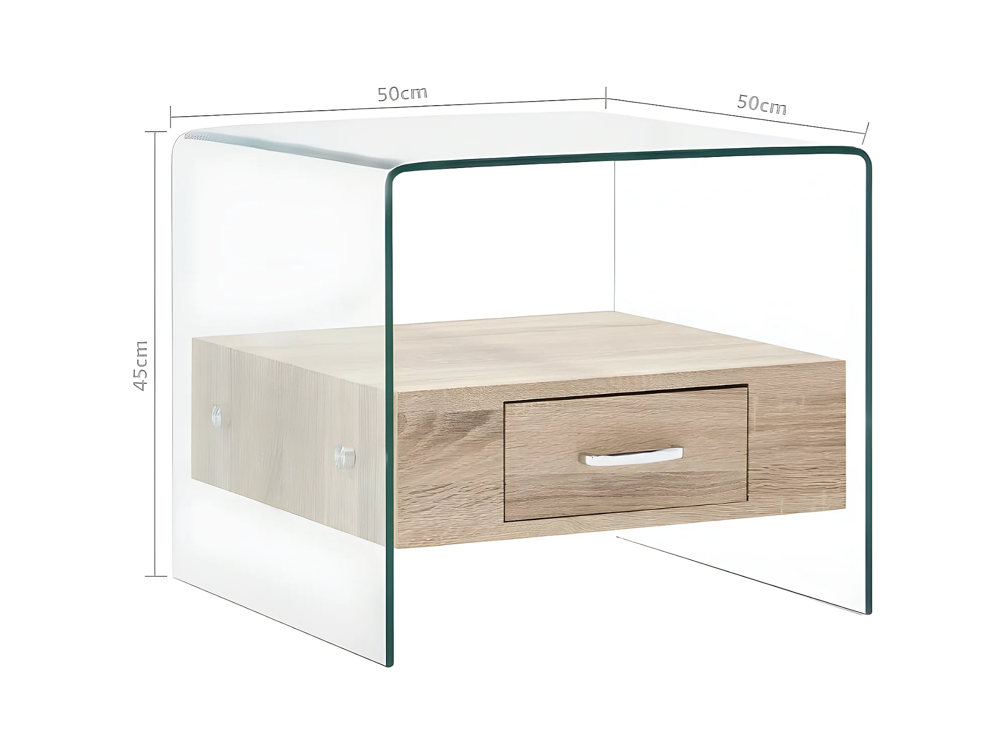 Table basse carrée 1 tiroir verre transparent et chêne clair Allissa