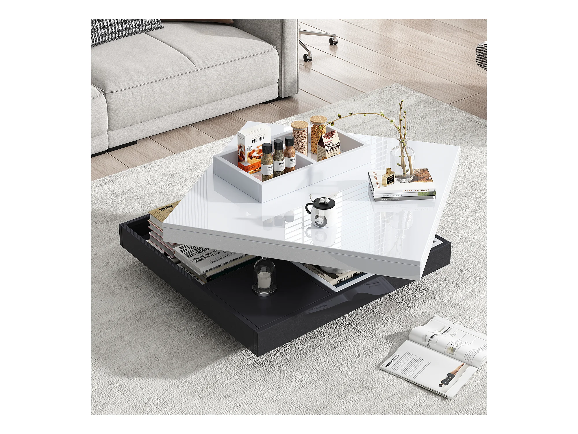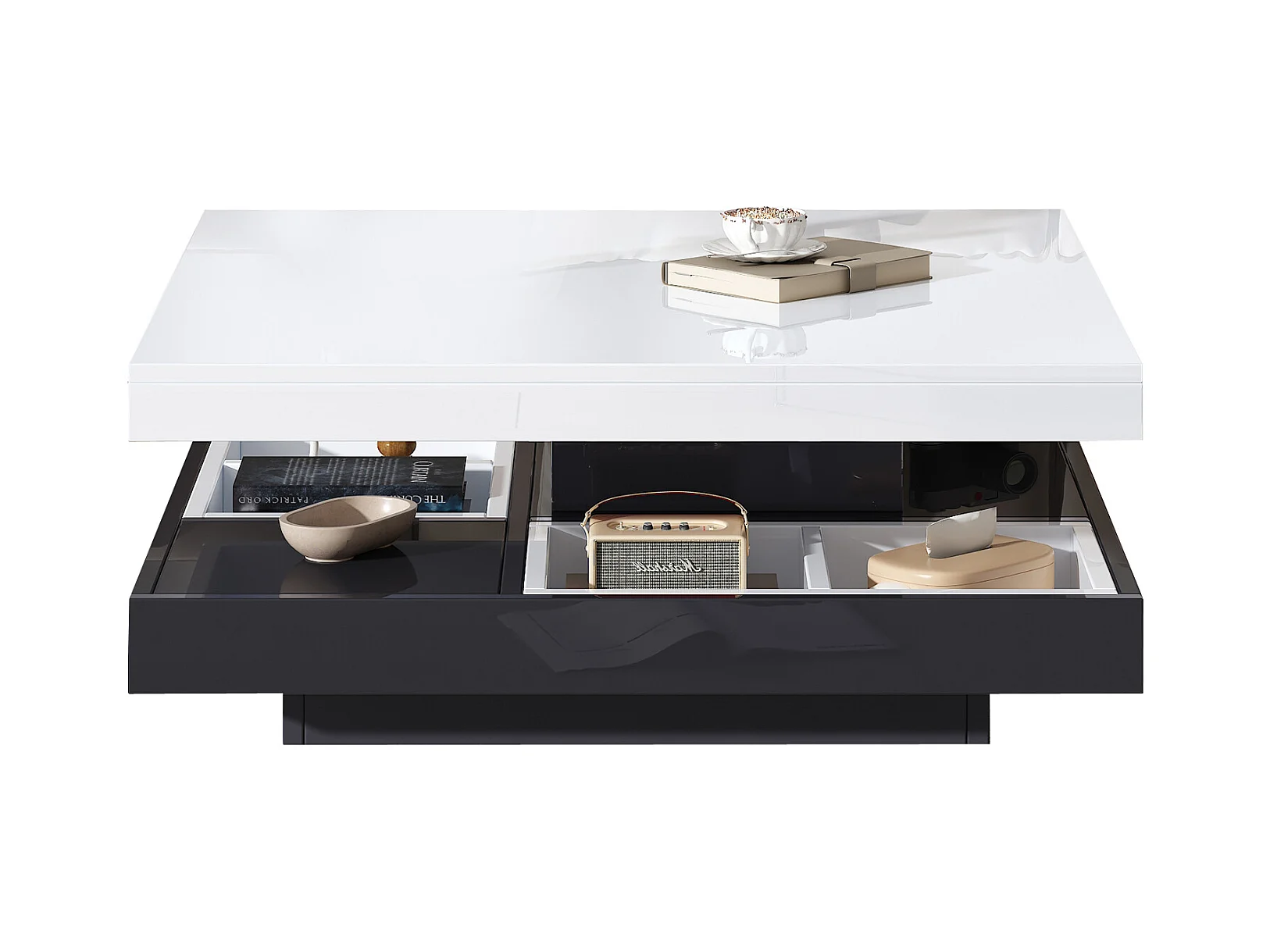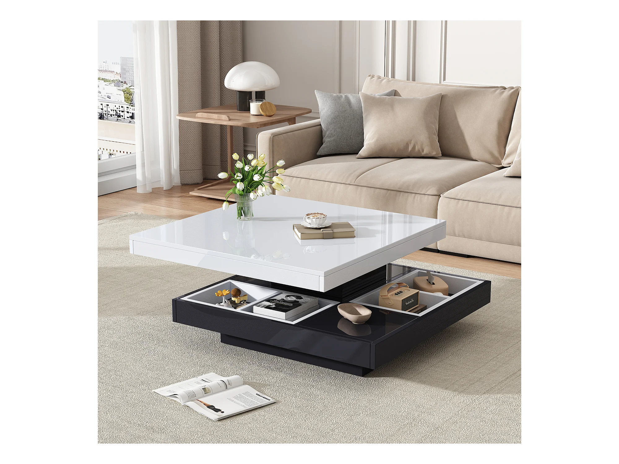 Table basse avec rangements 70x70x36 cm - plateau brillant orientable à 360° - Blanc & Noir