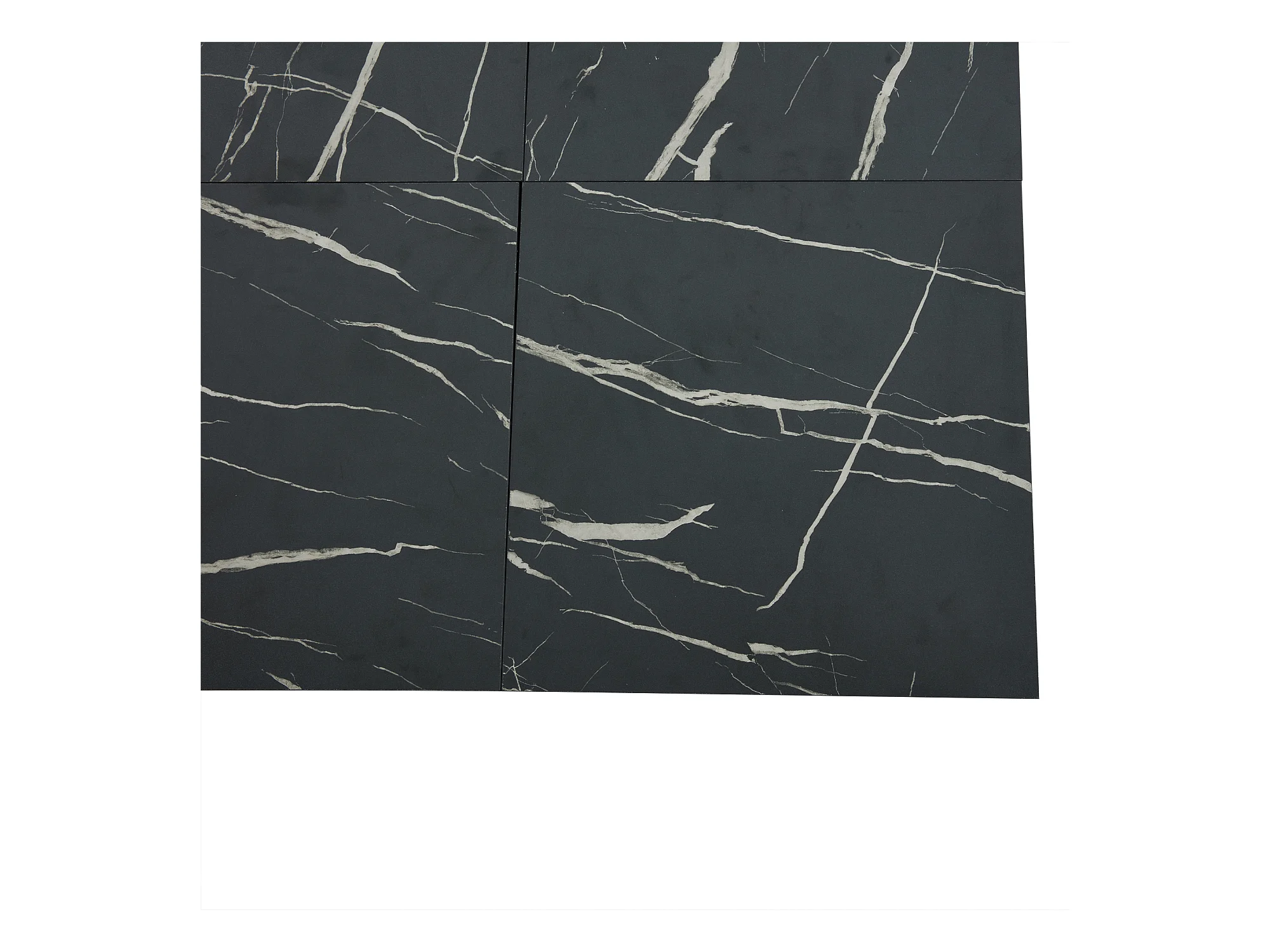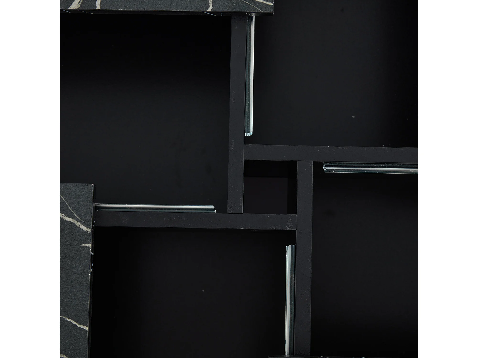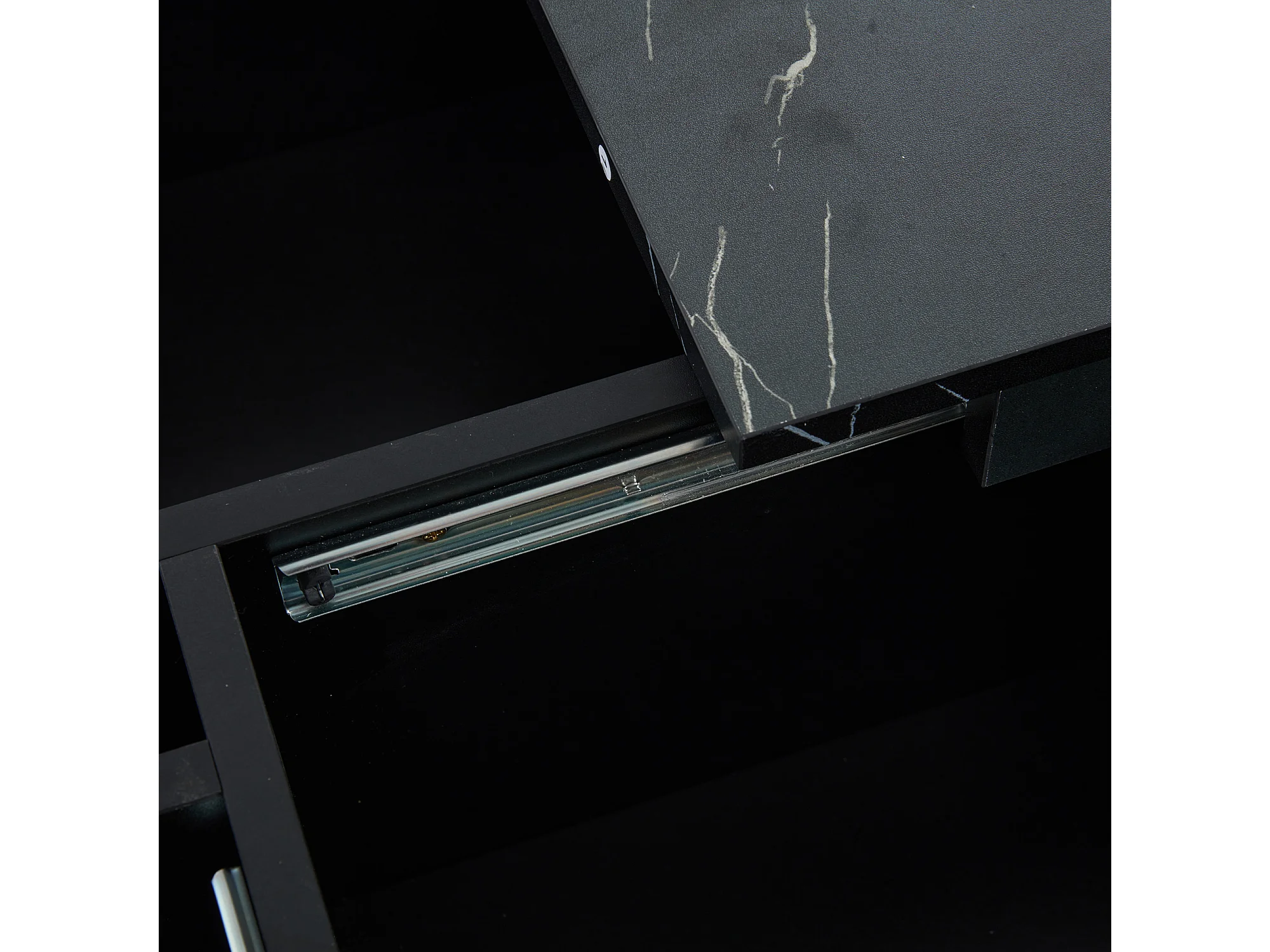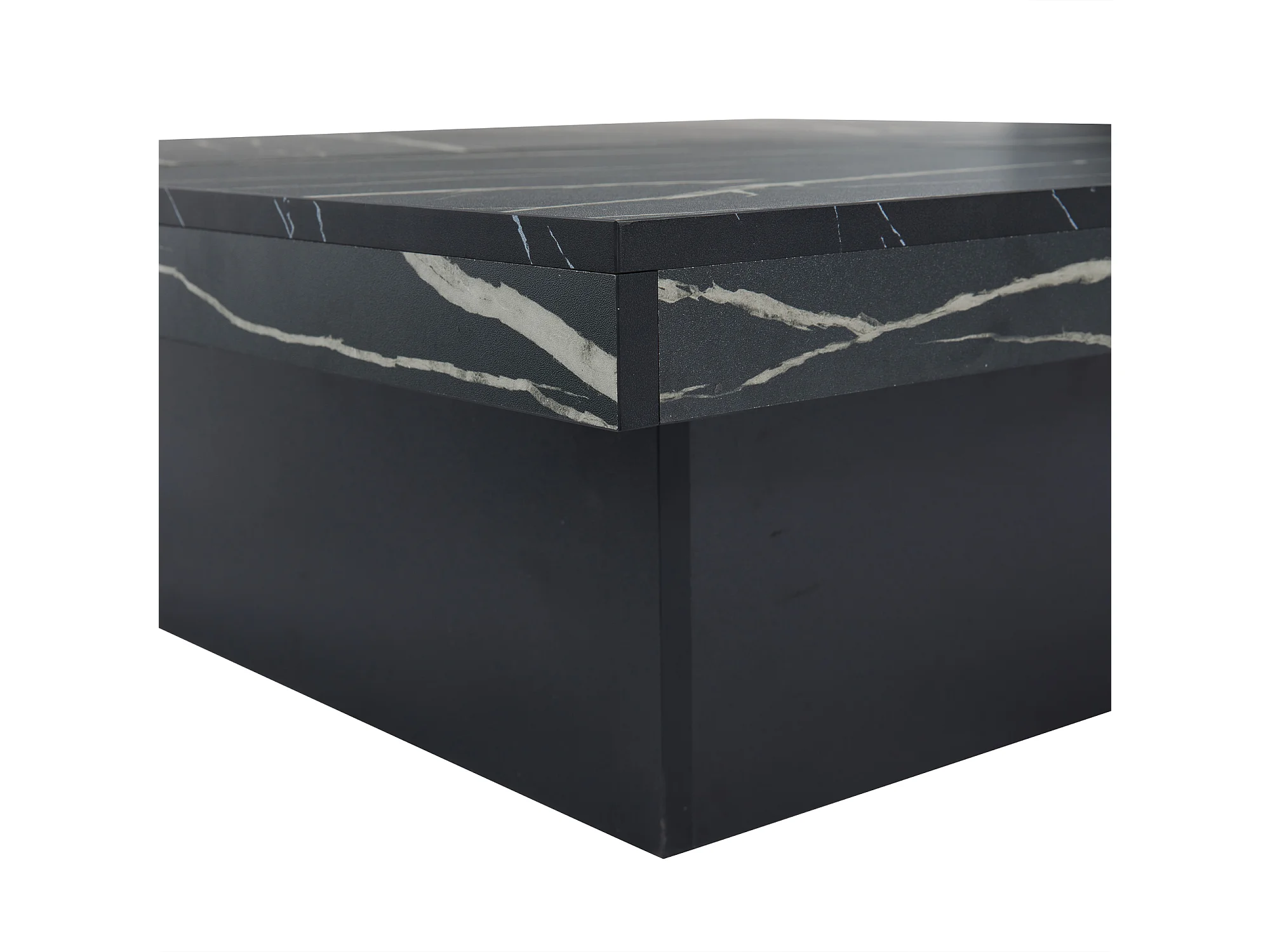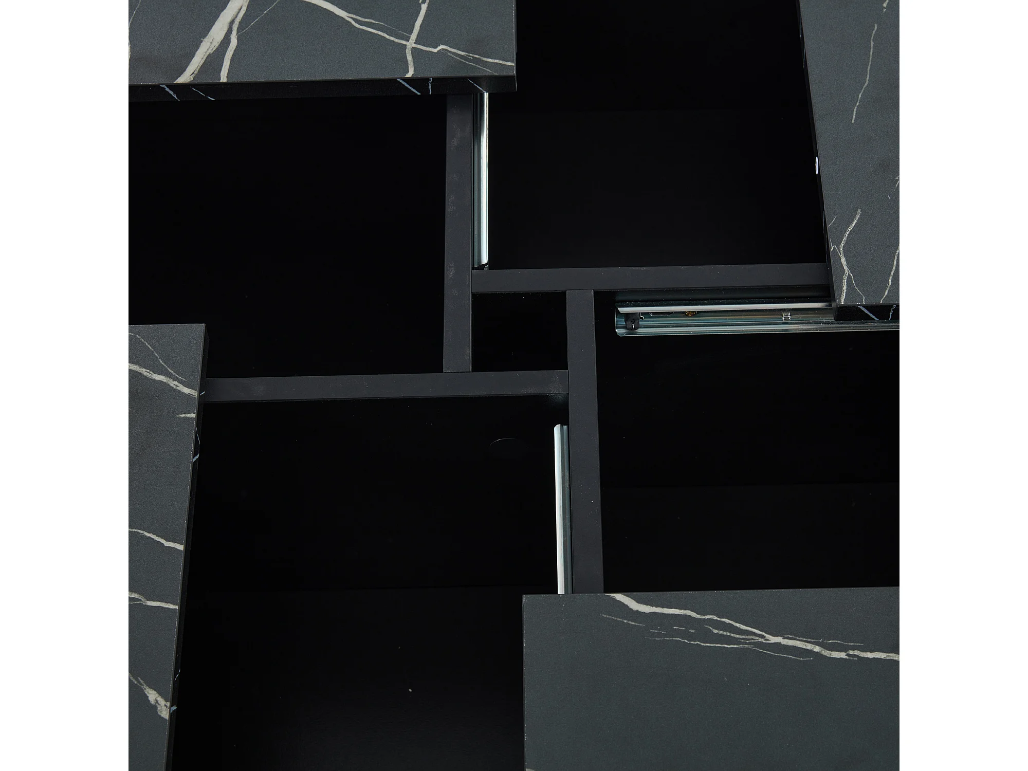 Table basse carrée moderne à effet marbre, panneau de particules, noir, avec 4 tiroirs et plateau coulissant (90x90x25cm)