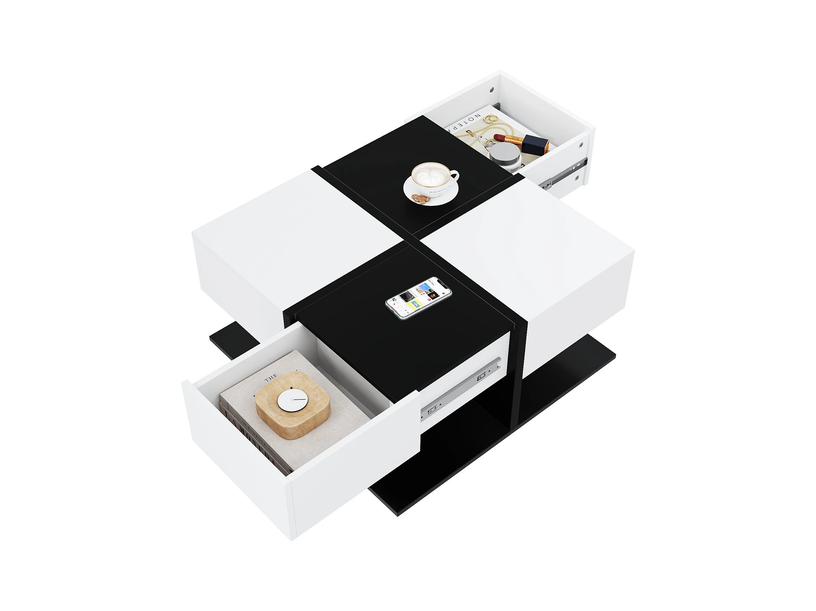 Table basse carrée noir et blanc - Table basse avec 3 tiroirs et plateau relevable - rangement ouvert