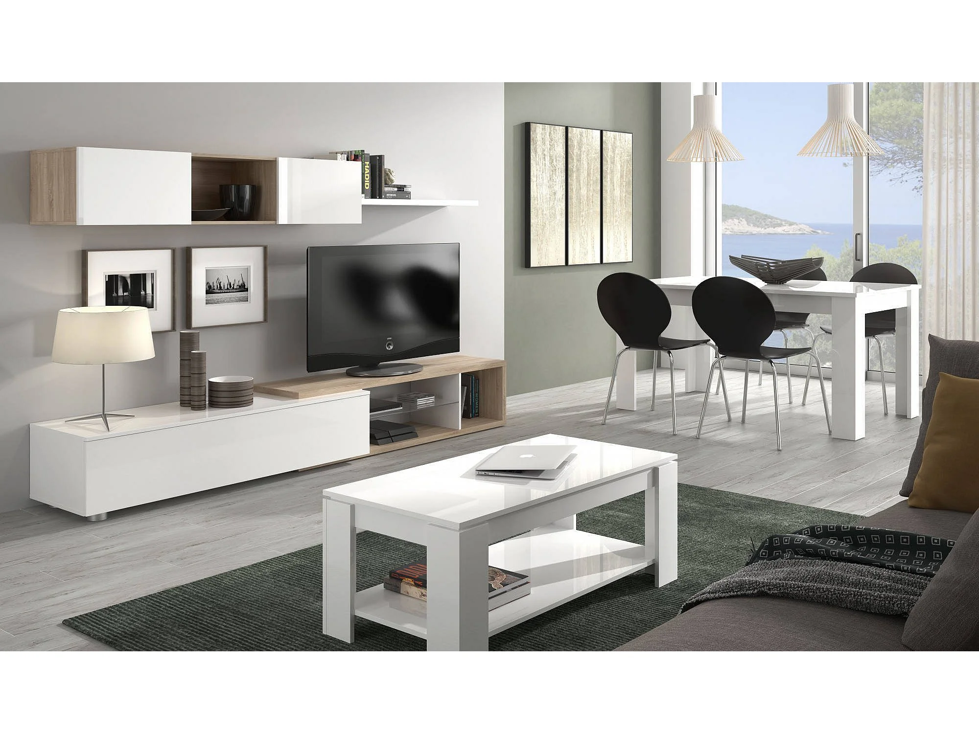 Table basse Chicago, Table basse avec étagère élévatrice, Table basse de salon, 102x50h43/54 cm, Blanc mat