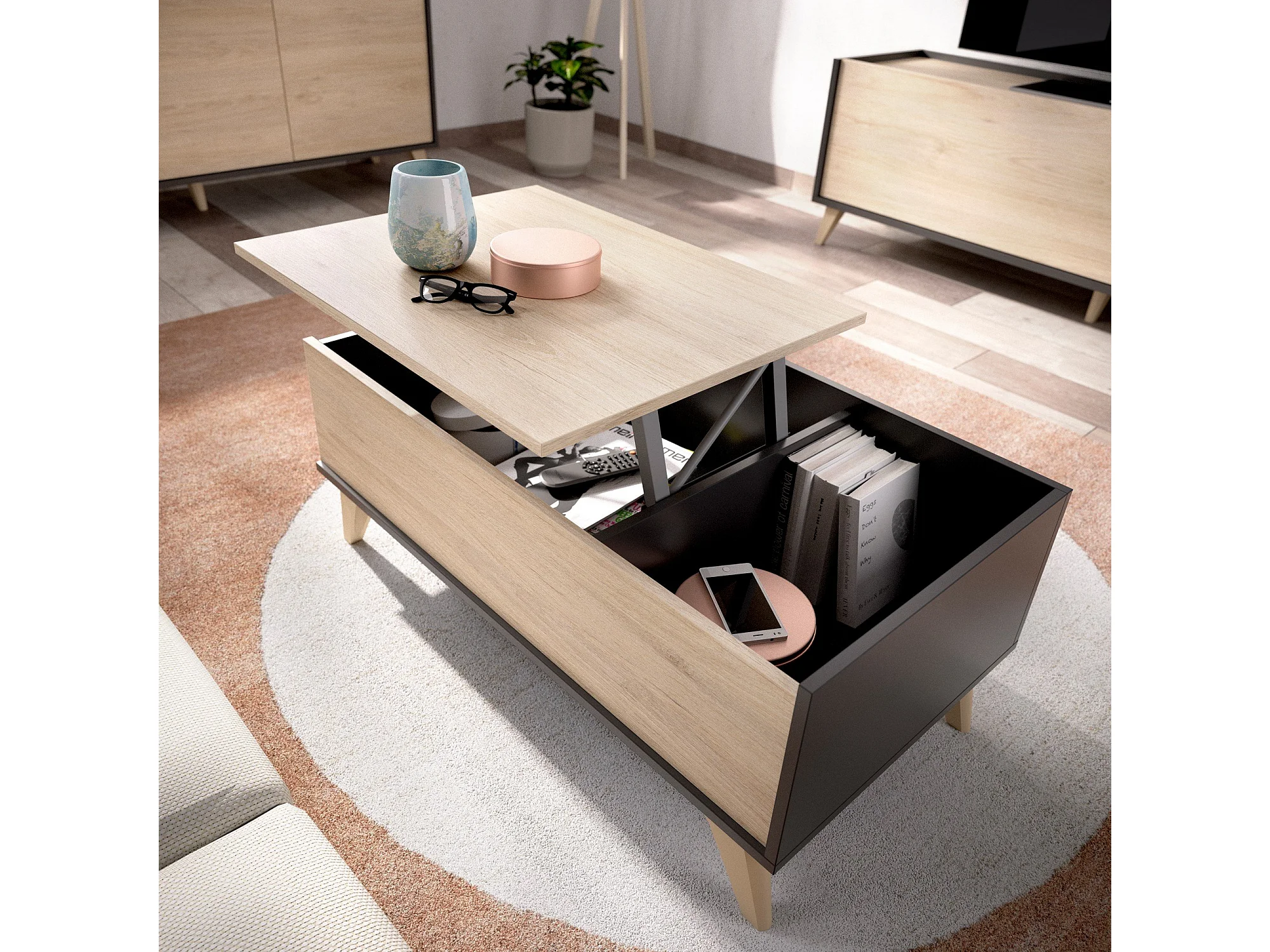 Table basse Cuna, Porte-revues de salon avec compartiment de rangement, Table basse élévatrice, 99x60h41 cm, Anthracite et Chêne