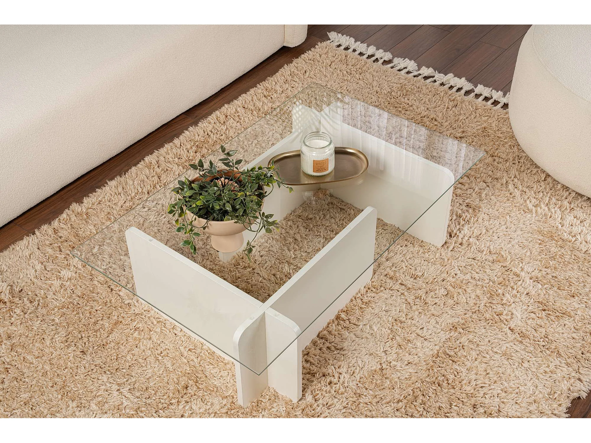 Table basse moderne Kerlo L105cm Bois Blanc et Verre trempé Transparent