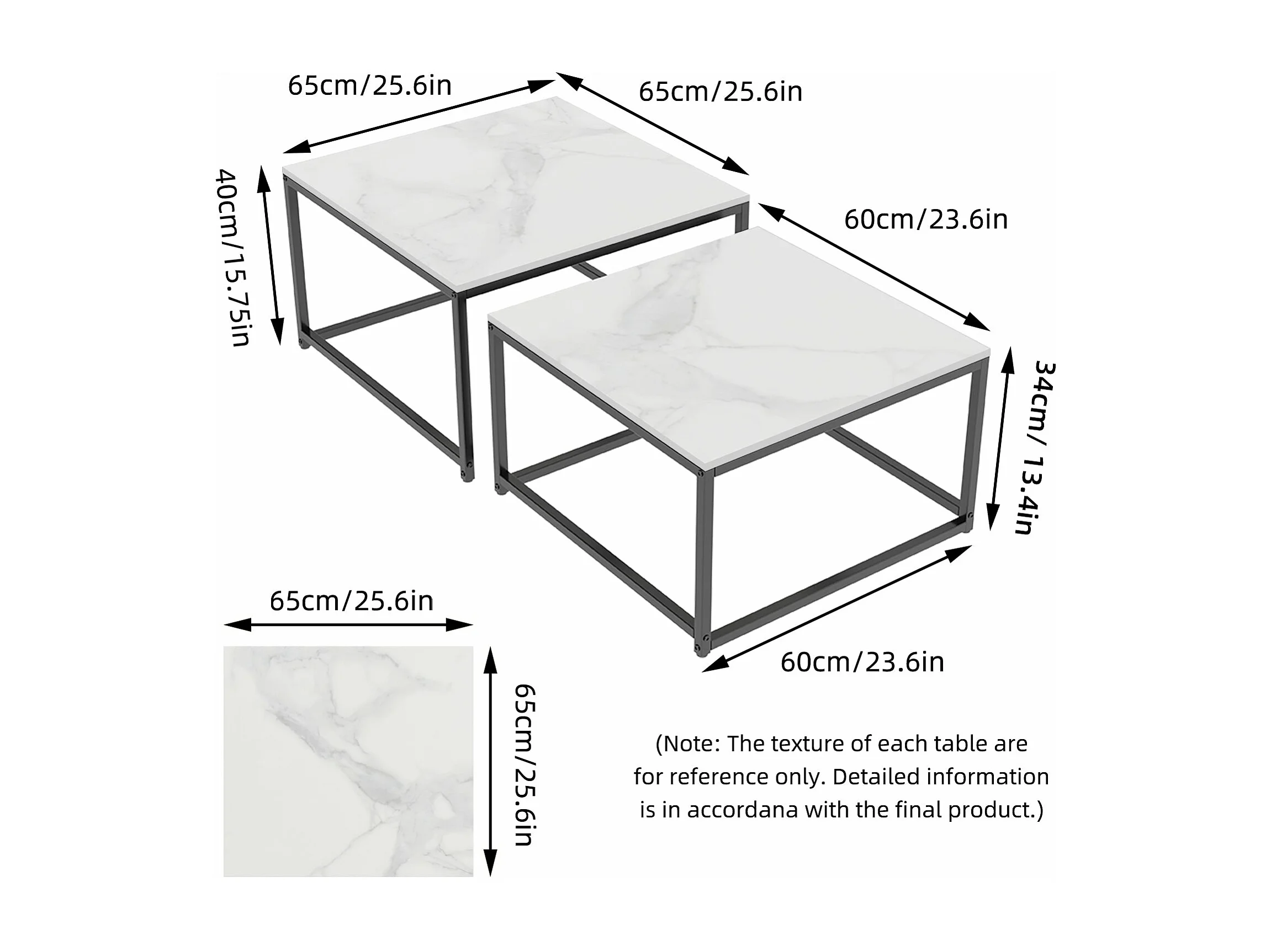 Table basse gigogne marbre industrielle salon lot de 2 avec pieds noire en métal 70x70x48cm / 60x60x43cm