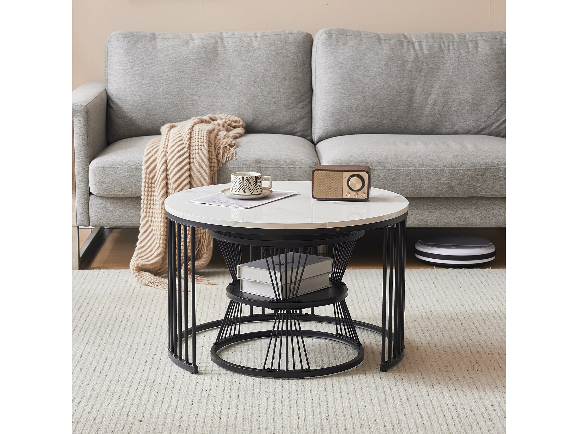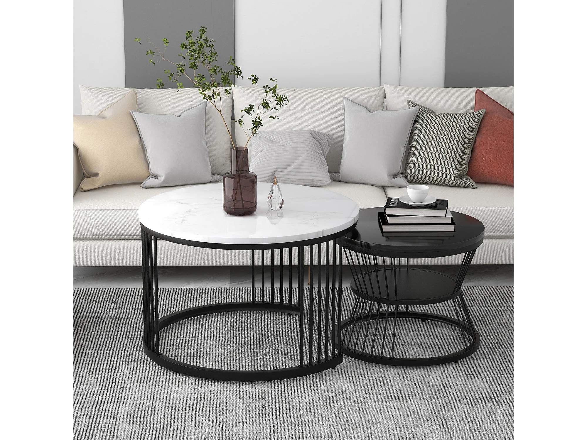 Table basse gigogne moderne, MDF, plateau laqué effet marbre, cadre noir (70x70x45.5+45x45x40cm)