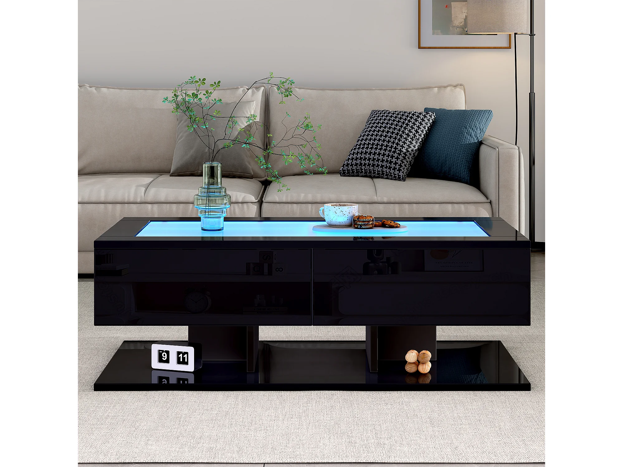 Table basse haute brillance 100x50x35 cm - 2 tiroirs - Avec éclairage LED - Plateau en verre - Panneaux de particules - Noir
