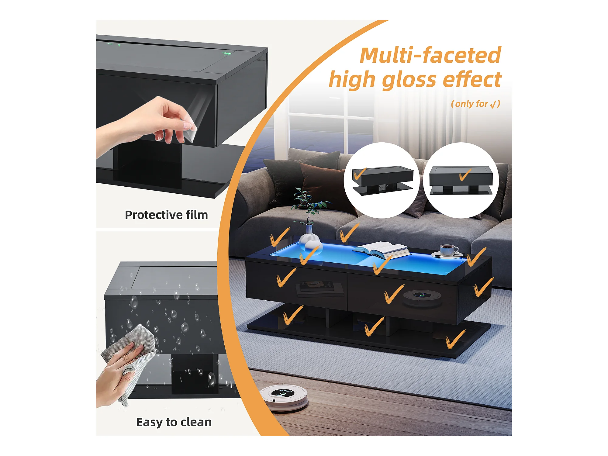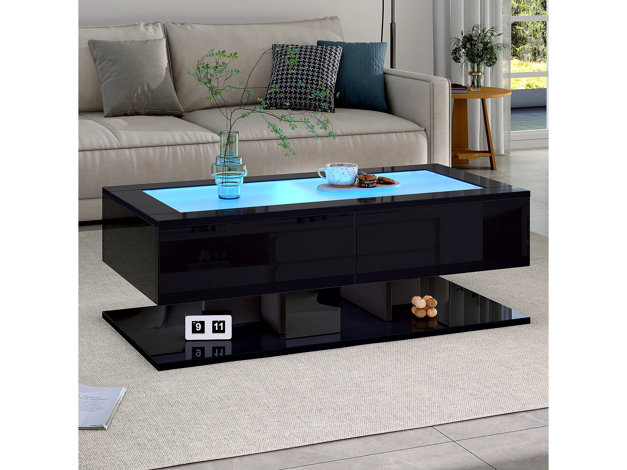 Table basse rectangulaire avec 2 tiroirs et 2 compartiments - 70 x 70 x 35cm - LEDs - panneaux de particules - noir brillant