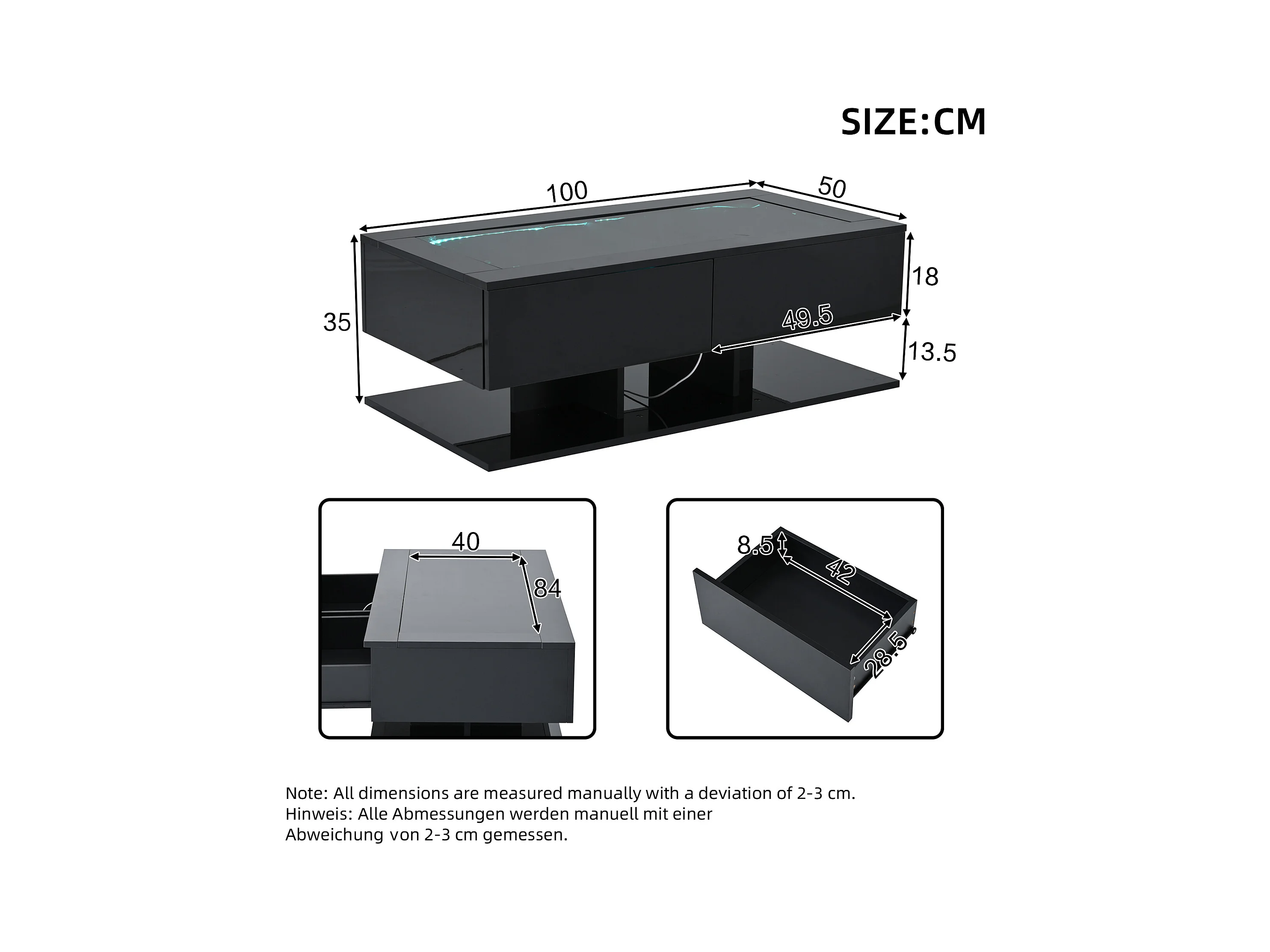 Table basse 100x50x35cm - avec éclairage LED - 2 tiroirs - noir
