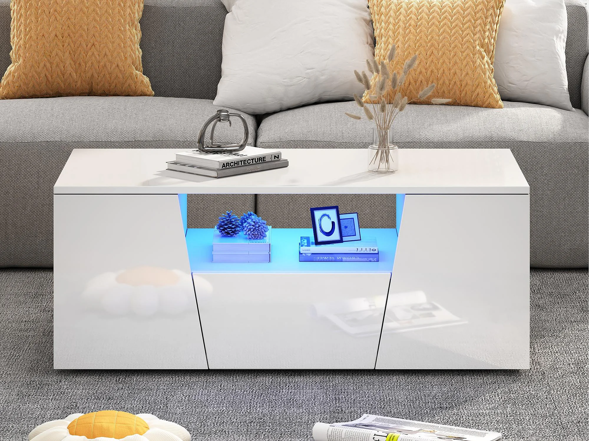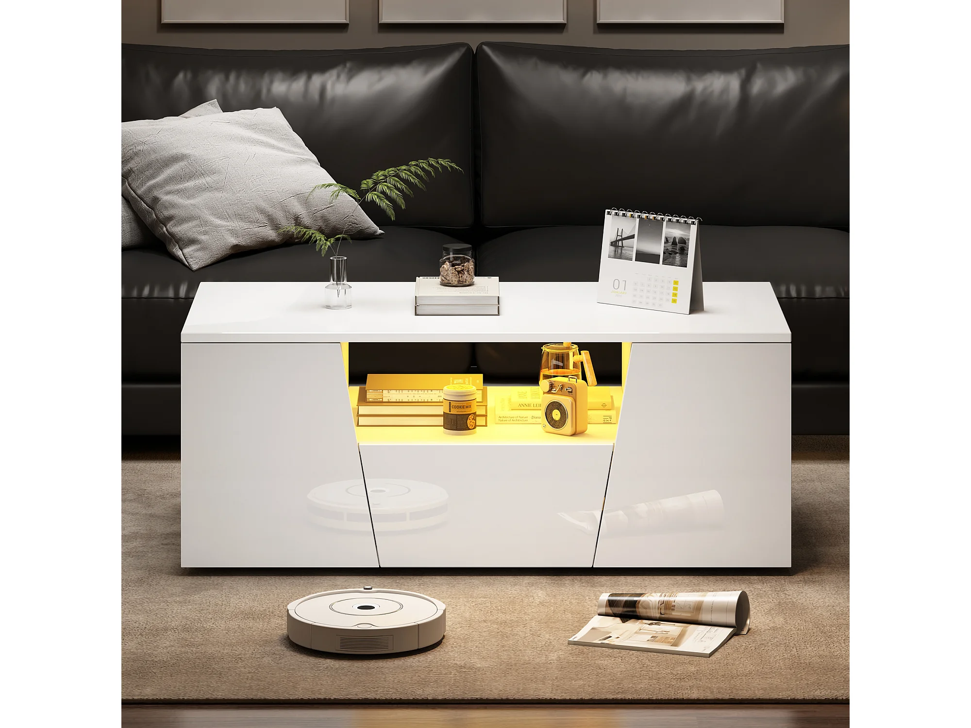 Table basse haute brillance 100x50x40 cm - avec éclairage LED - 2 portes et 1 tiroir - blanc