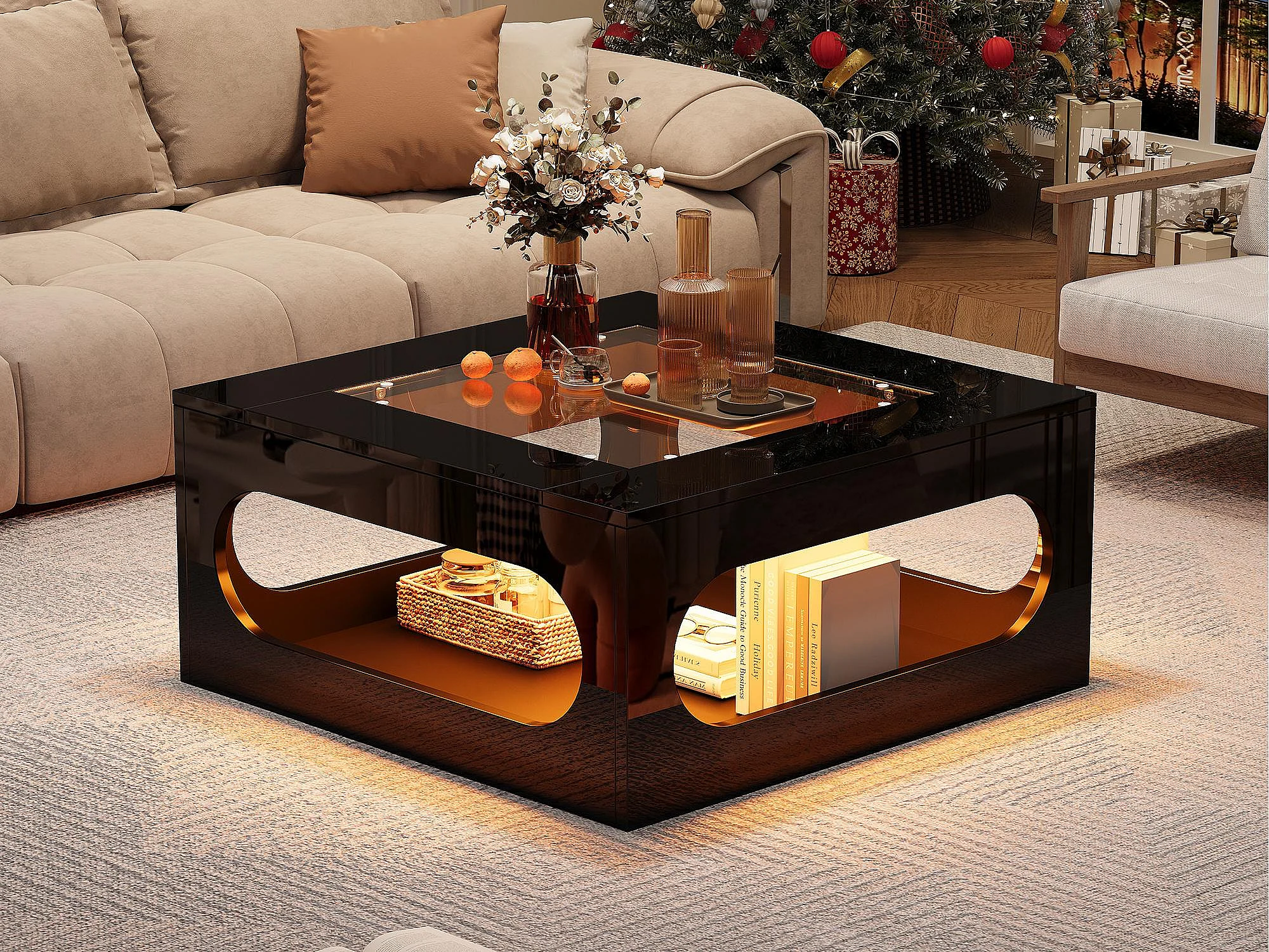 Table basse carrée brillante 70x70x36 cm - plateau en verre - avec éclairage LED - panneaux de particules - noir