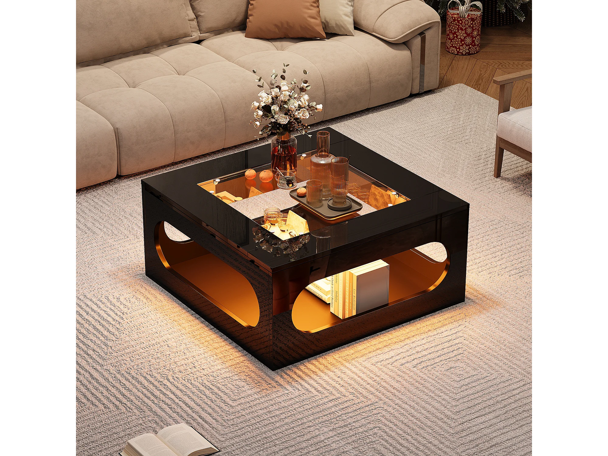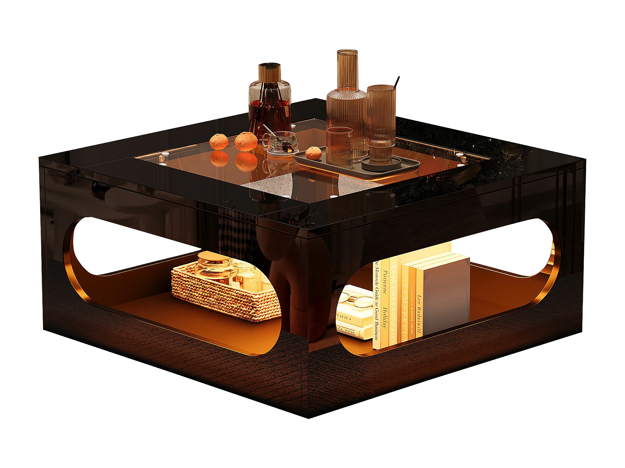 Table basse carrée brillante 70x70x36 cm - Avec éclairage LED - Avec 2 tiroirs - Noir