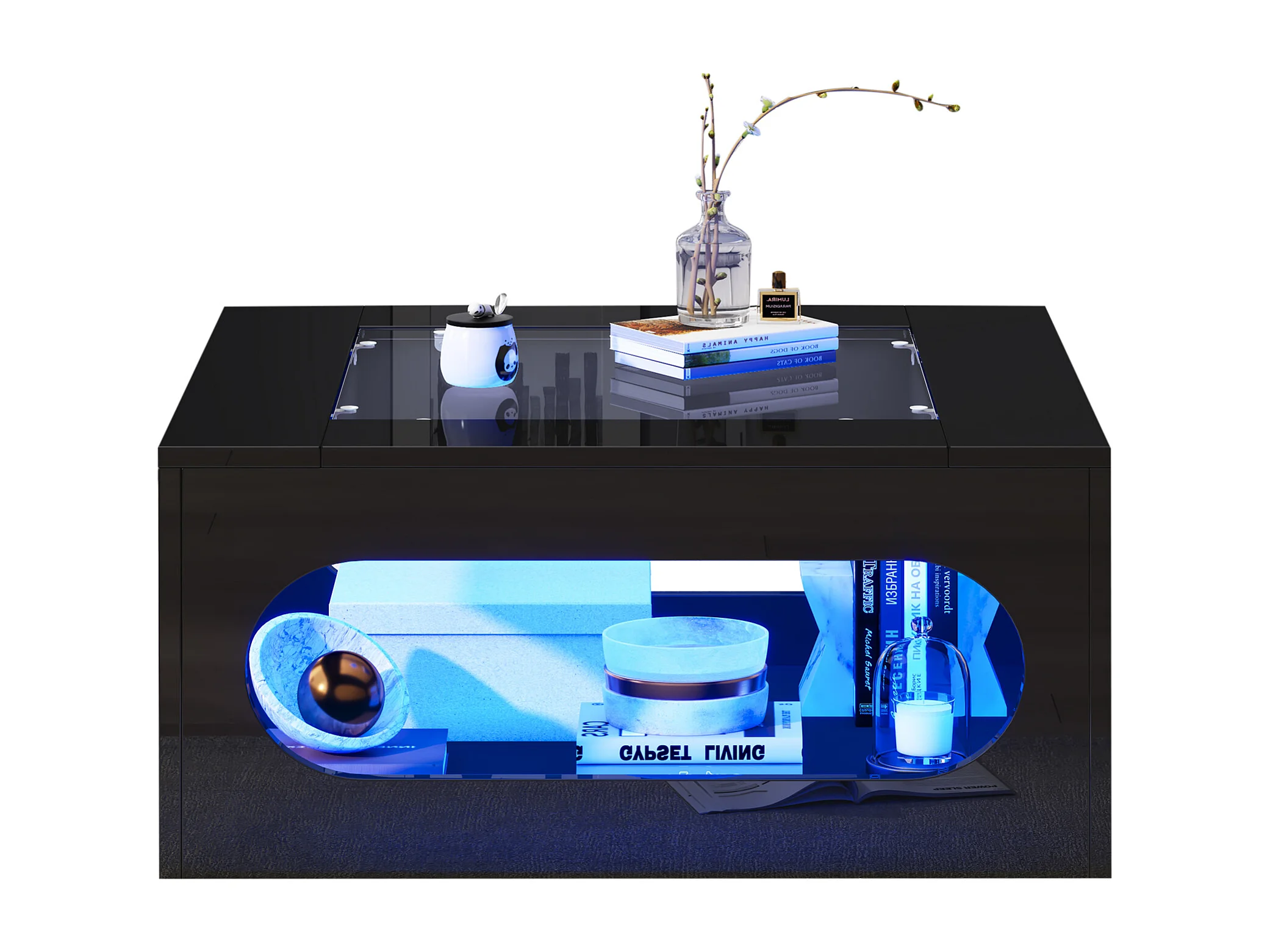 Table basse moderne 105x50x35 cm - plateau en verre - avec éclairage LED - 2 tiroirs - étagères ouvertes - noir