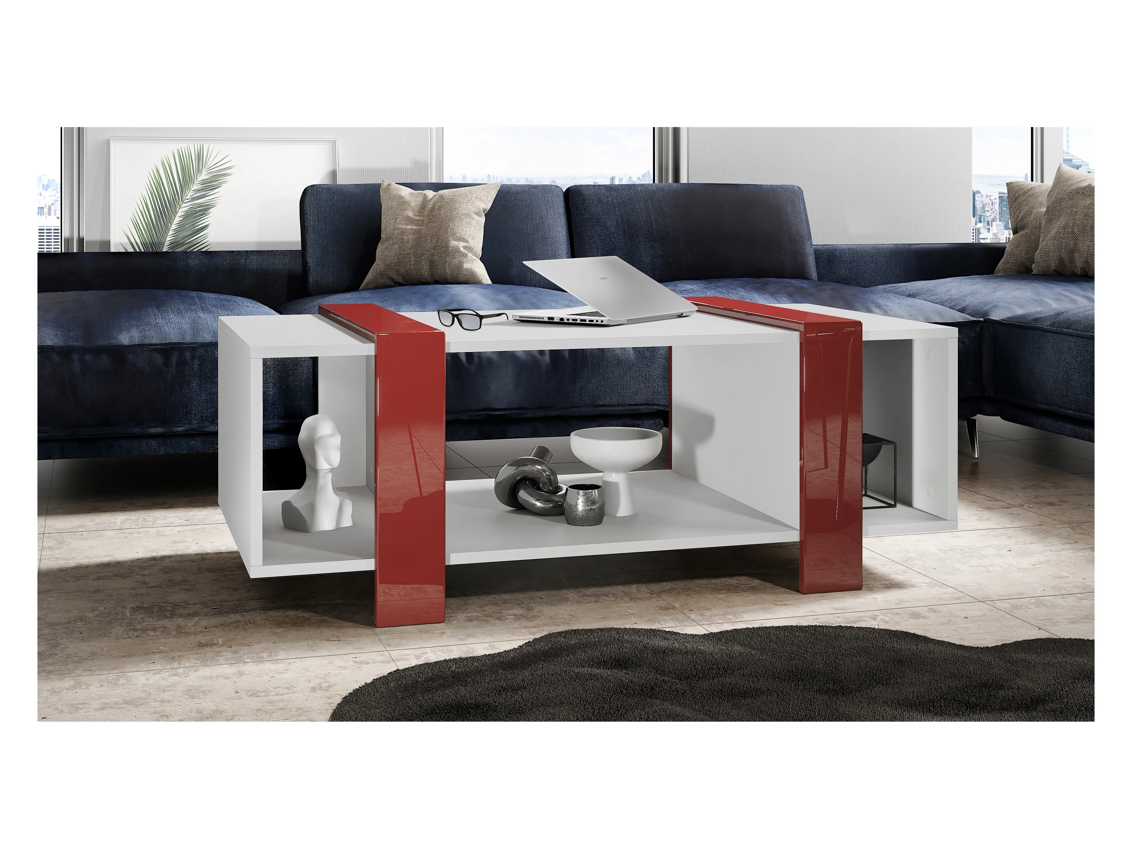 Table basse Ida 110,5 x 42 x 56,5 cm Table de salon à trois compartiments, caisson en blanc mat, façades en Bordeaux brillant | Grand choix de couleurs