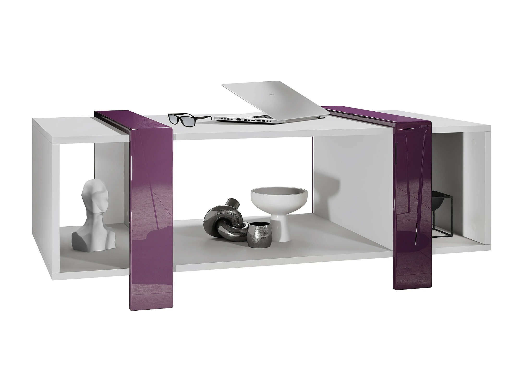 Table basse Ida 110,5 x 42 x 56,5 cm Table de salon à trois compartiments, caisson en blanc mat, façades en Mûre haute brillance | Grand choix de couleurs