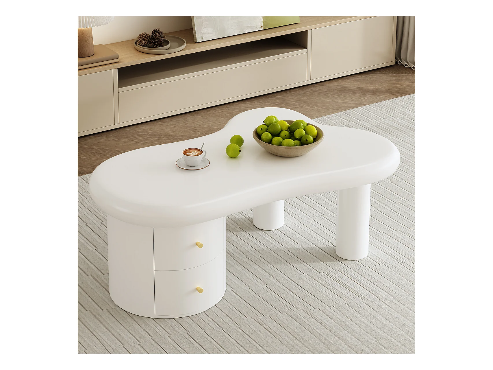 Table Basse Moderne, Forme Irrégulière, 2 Tiroirs, MDF, Blanc, (97x64x42 cm)