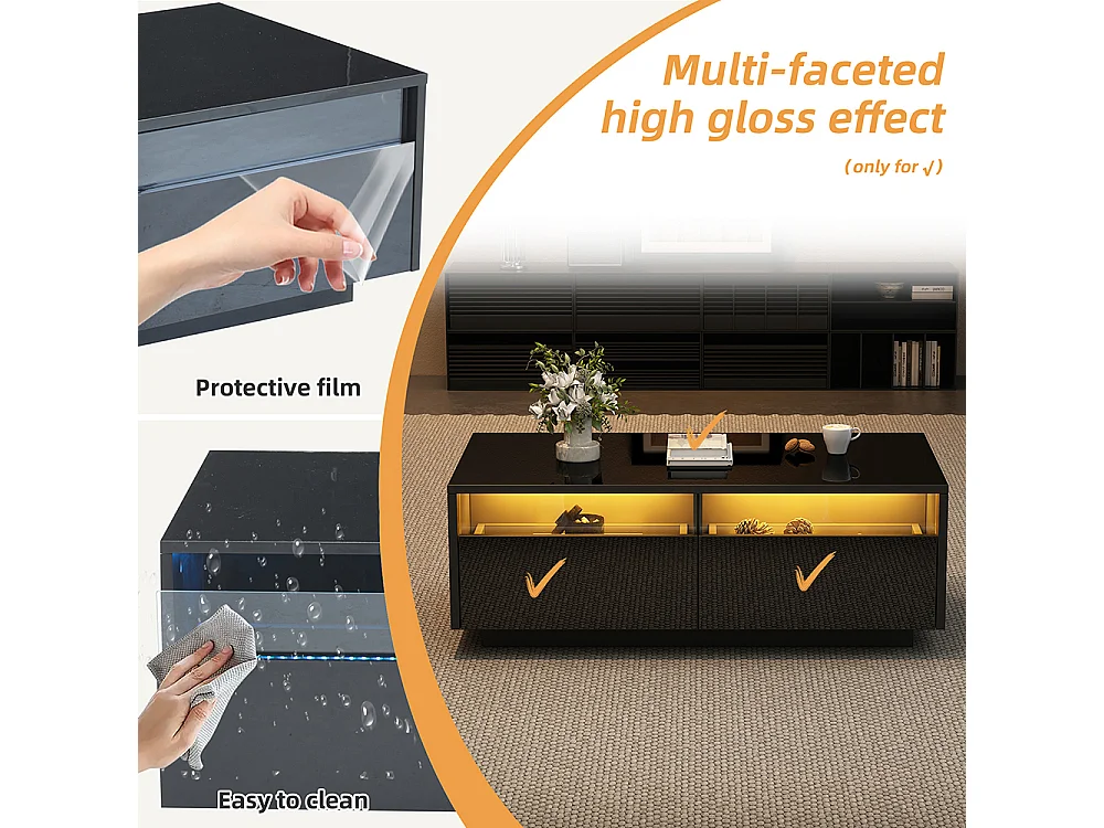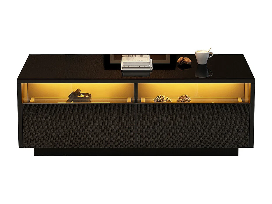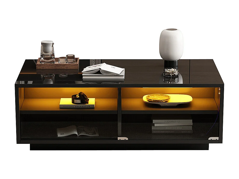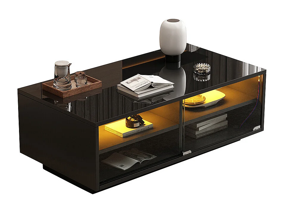 Table basse LED moderne noir brillant 2 tiroirs éclairage LED plateau acrylique MDF salon chambre