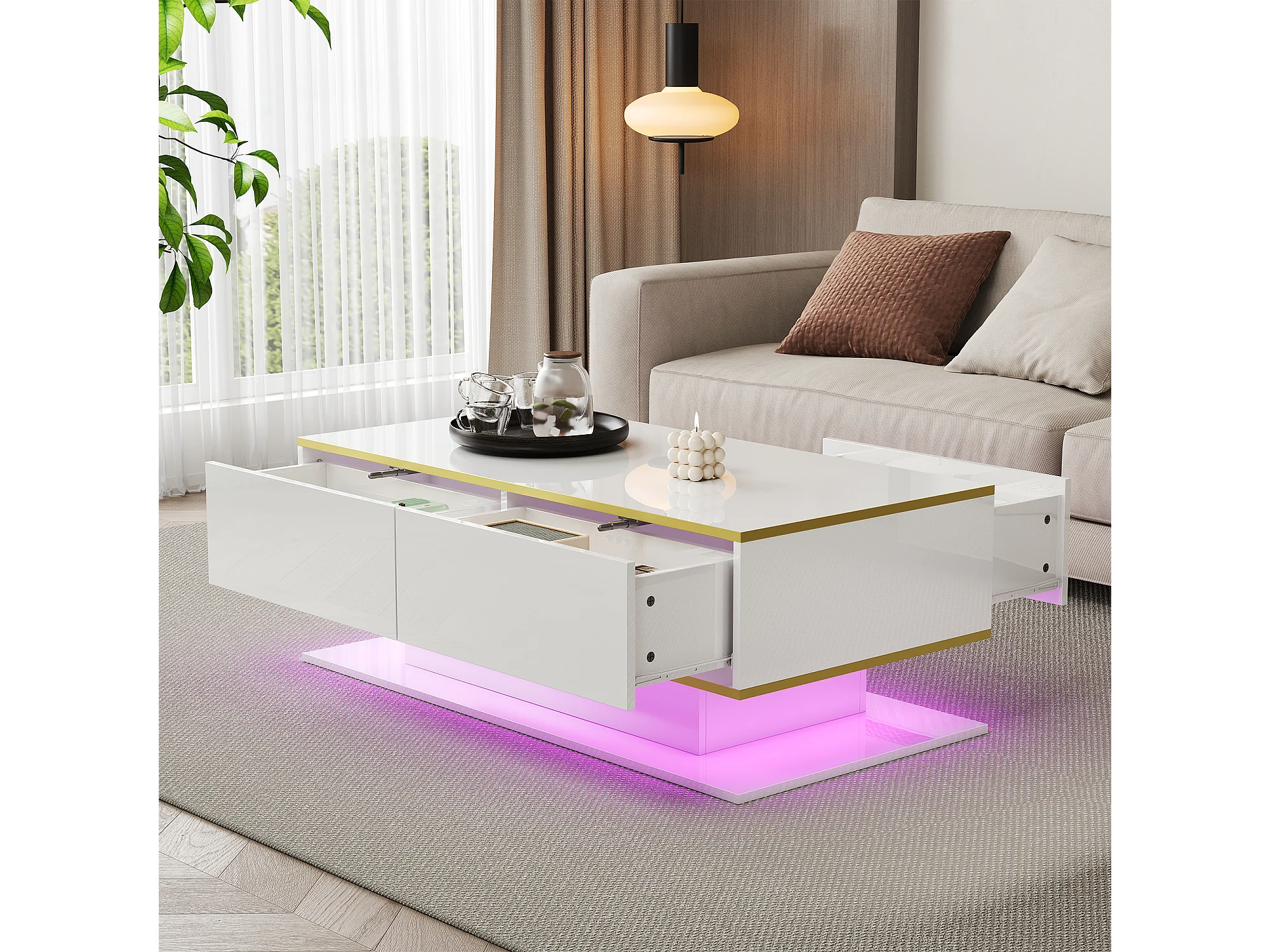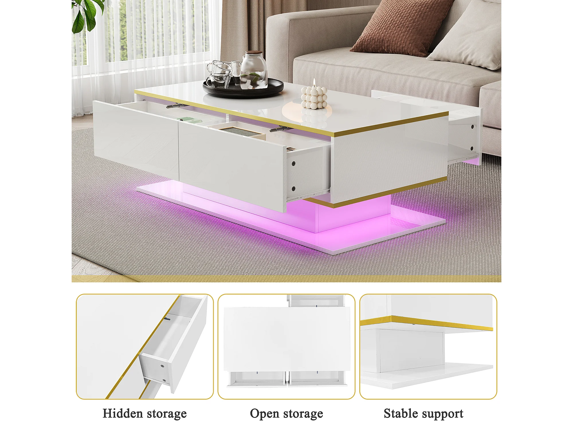 Table Basse LED Moderne, Bordure dorée, Table Basse Blanc avec Trois tiroirs