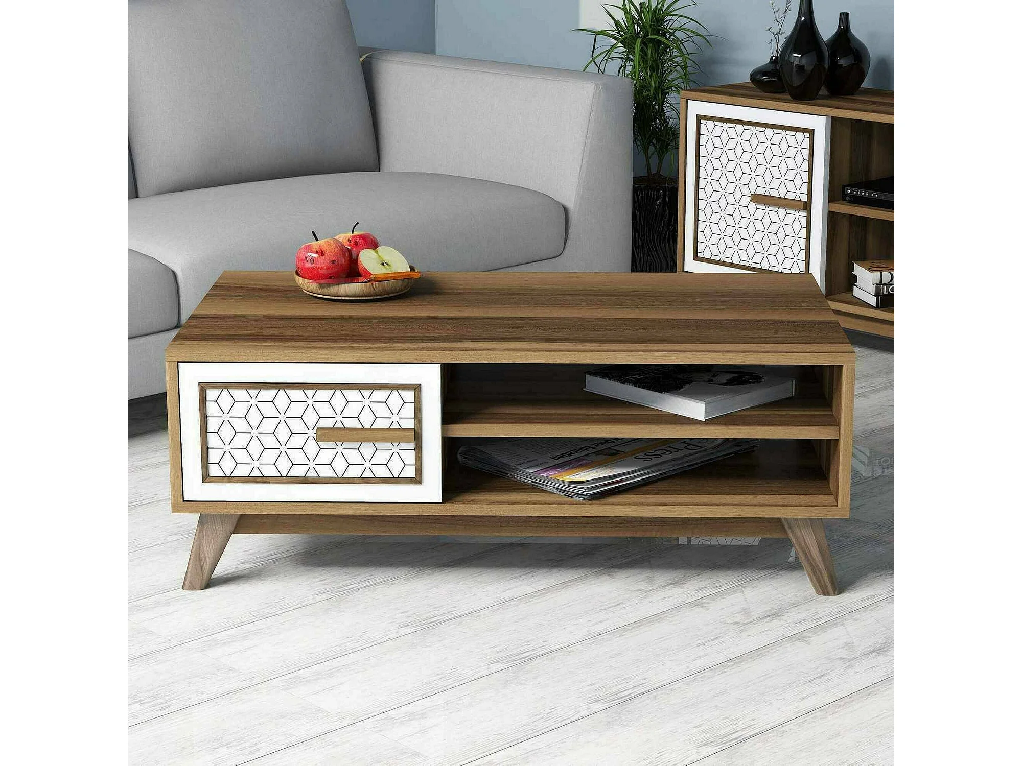 Table basse Lesath, Table basse, Porte-revues pour canapé, Etagère de salon, 105x60h38 cm, Noyer et Blanc