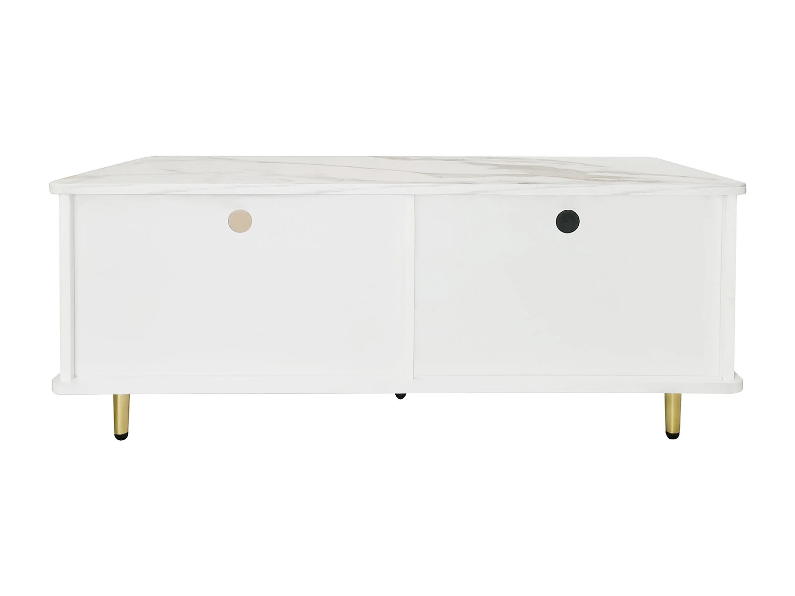 Table Basse LED Moderne, avec 2 Portes et 2 tiroirs, Dessus marbré et Accents dorés, Blanc