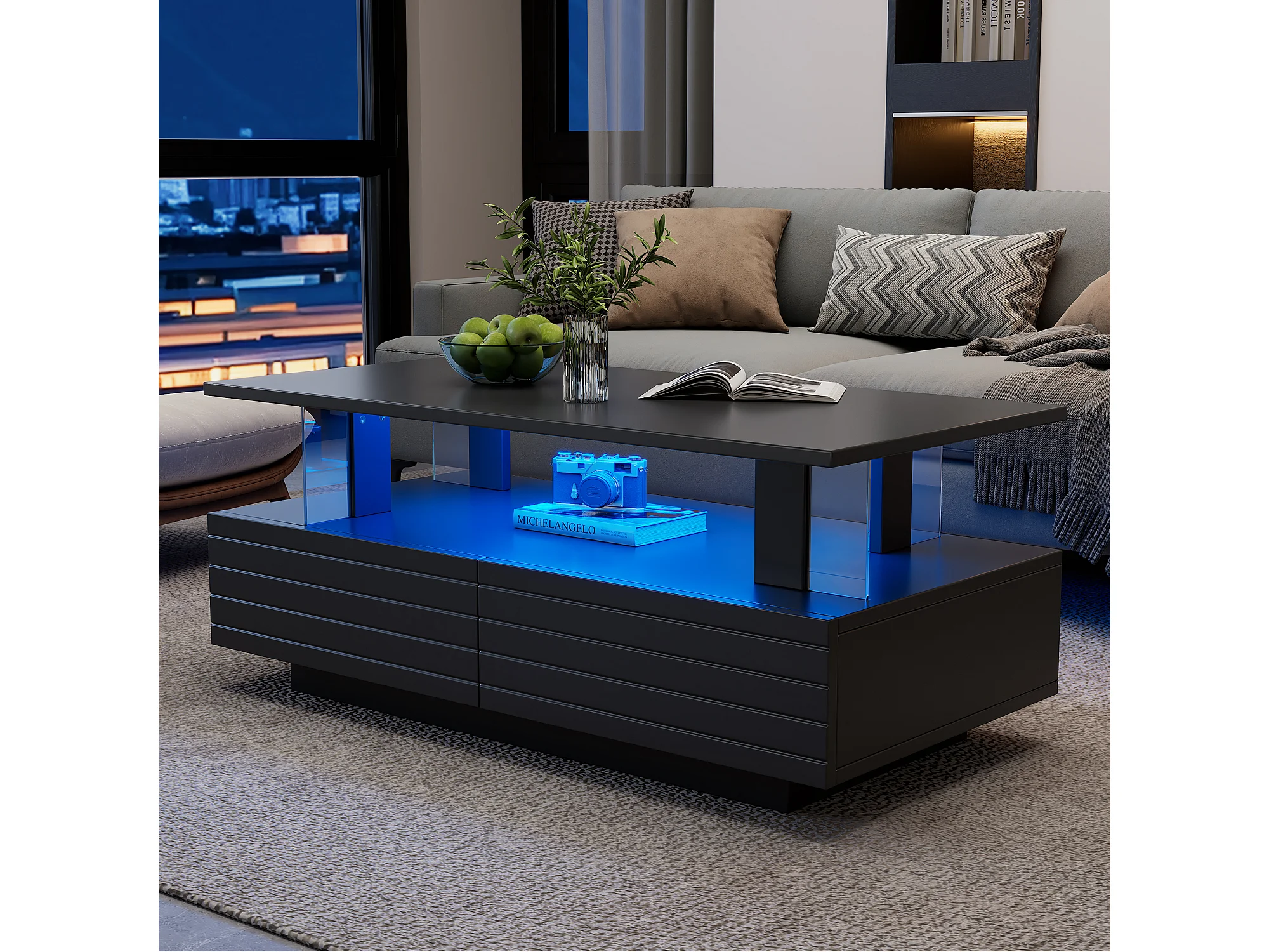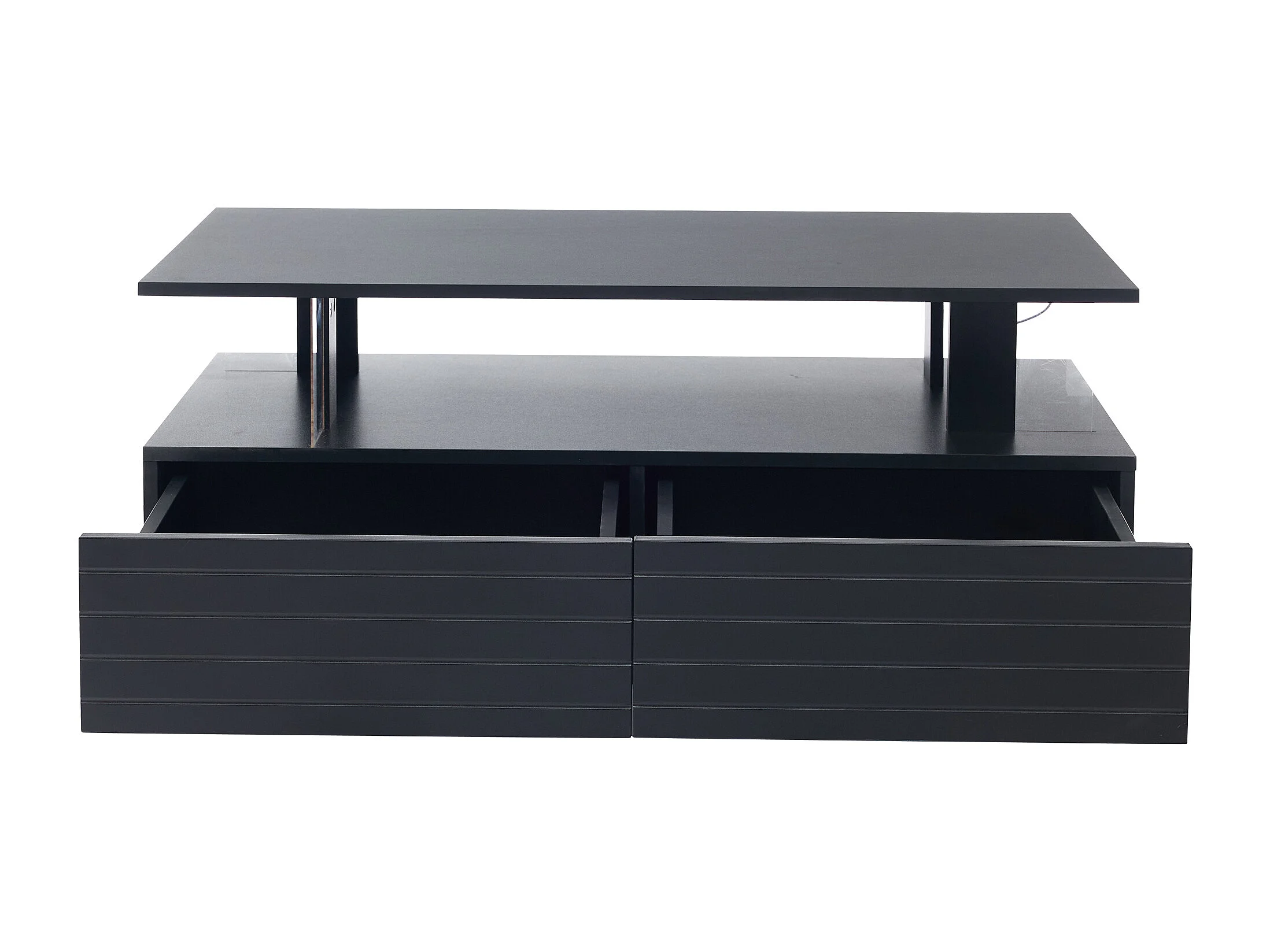 Table basse moderne avec 2 tiroirs en acrylique noir, structure double niveau