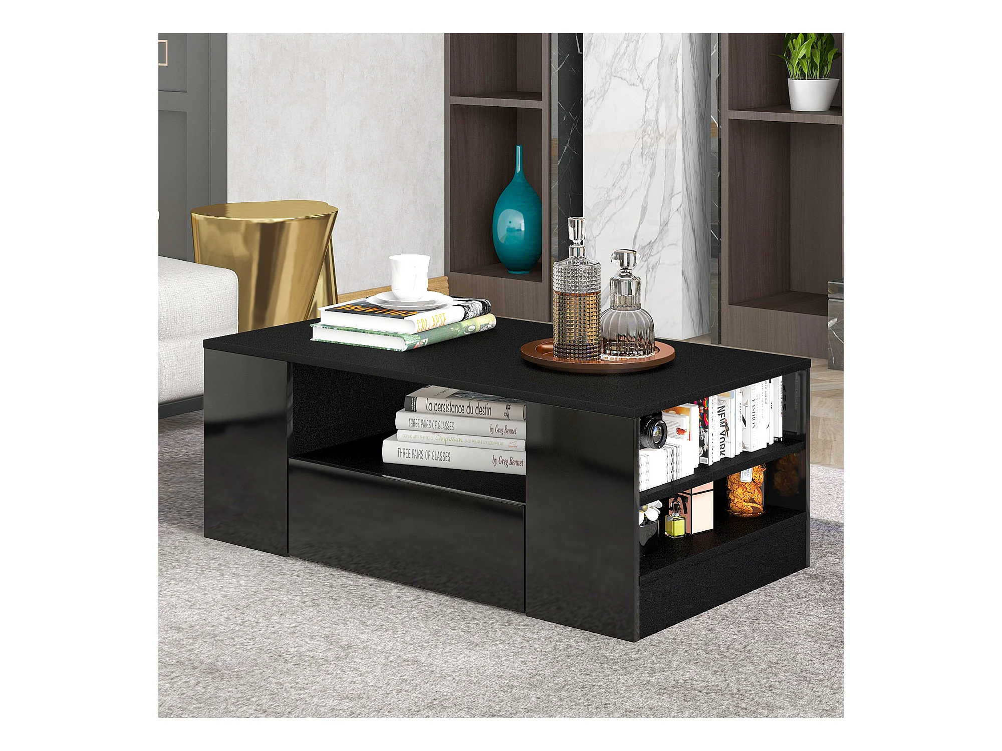 Table basse moderne avec tiroirs et étagères, LED, Noir laqué