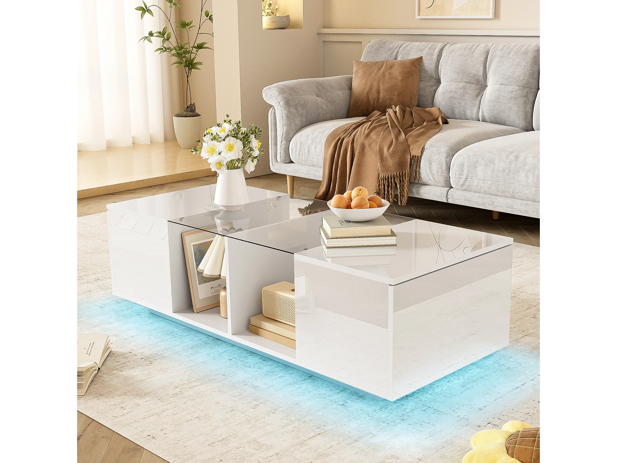Table de Salon LED Avec Espace de Rangement, Table Basse Brillante Avec Tiroirs, Moderne, Blanc