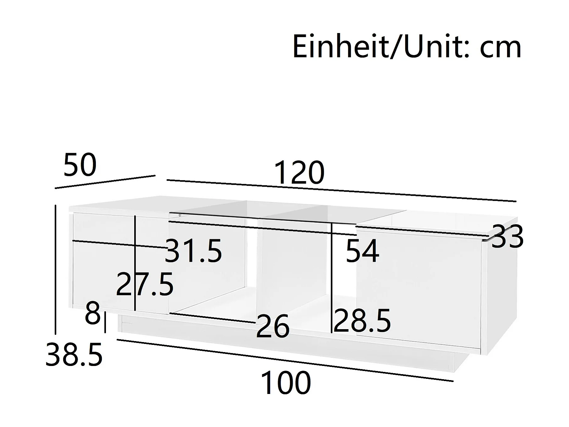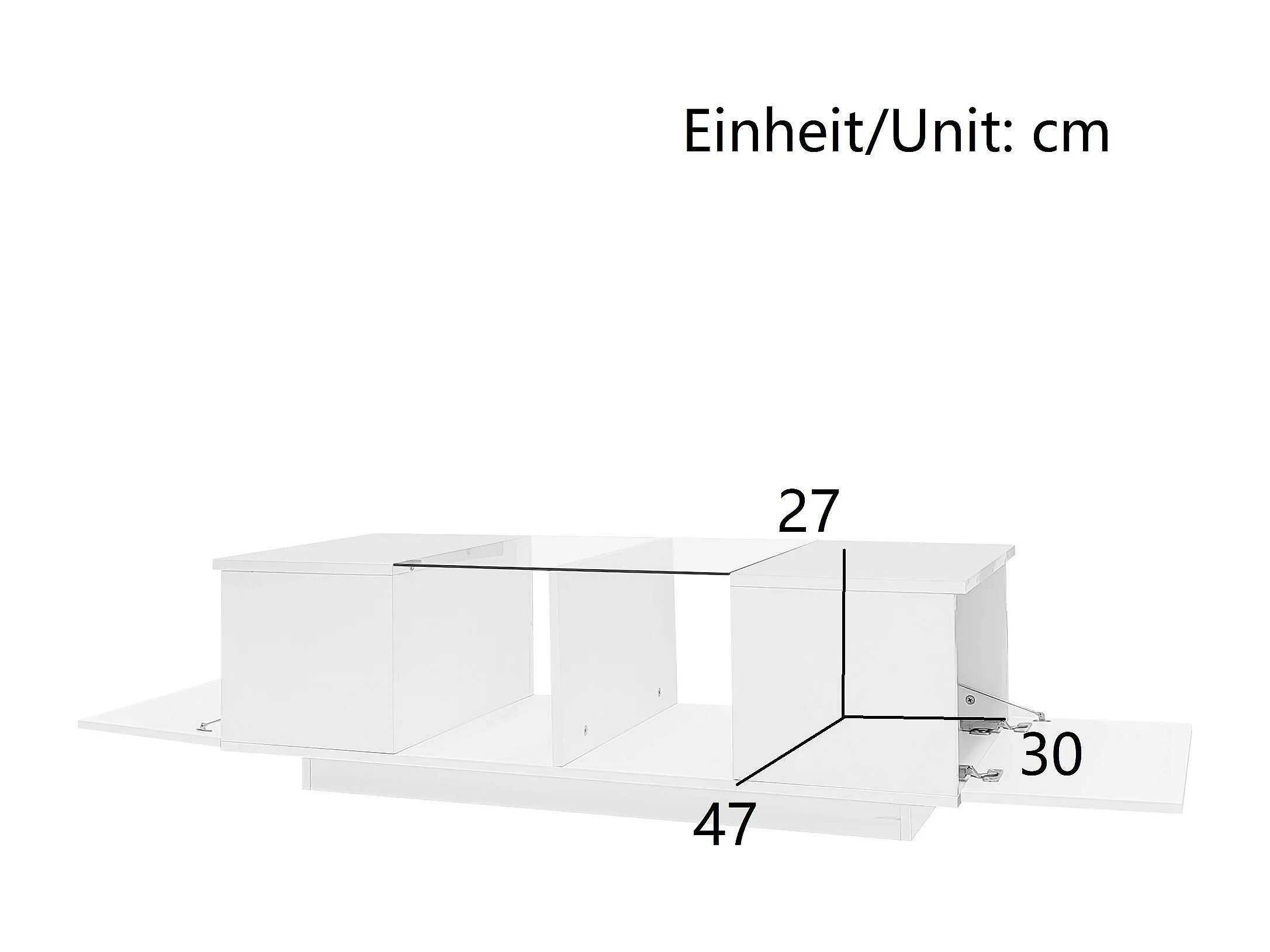 Table basse relevable - 120 x 50 x 46 cm - rangement dissimulé + Leds + 2 tiroirs - MDF + verre trempé - blanc