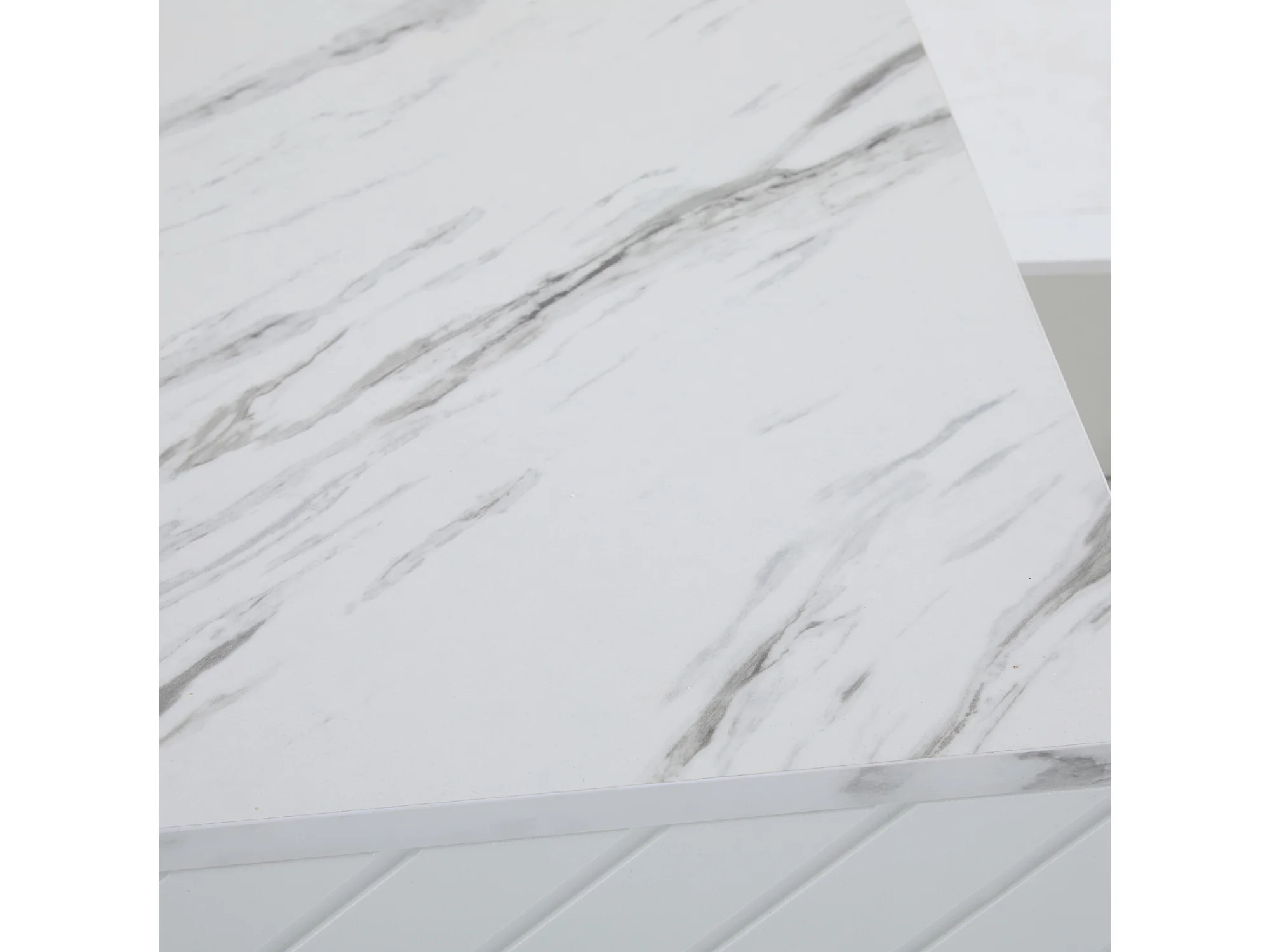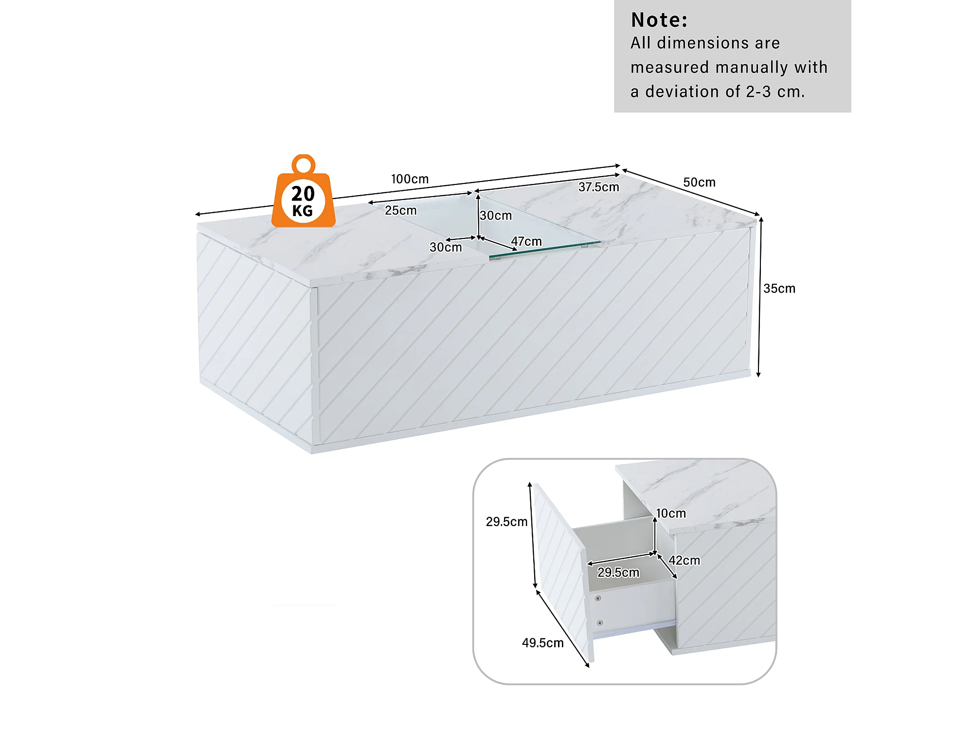 Table basse moderne blanche effet marbre, éclairage LED, élément en verre et 2 tiroirs Kregmots