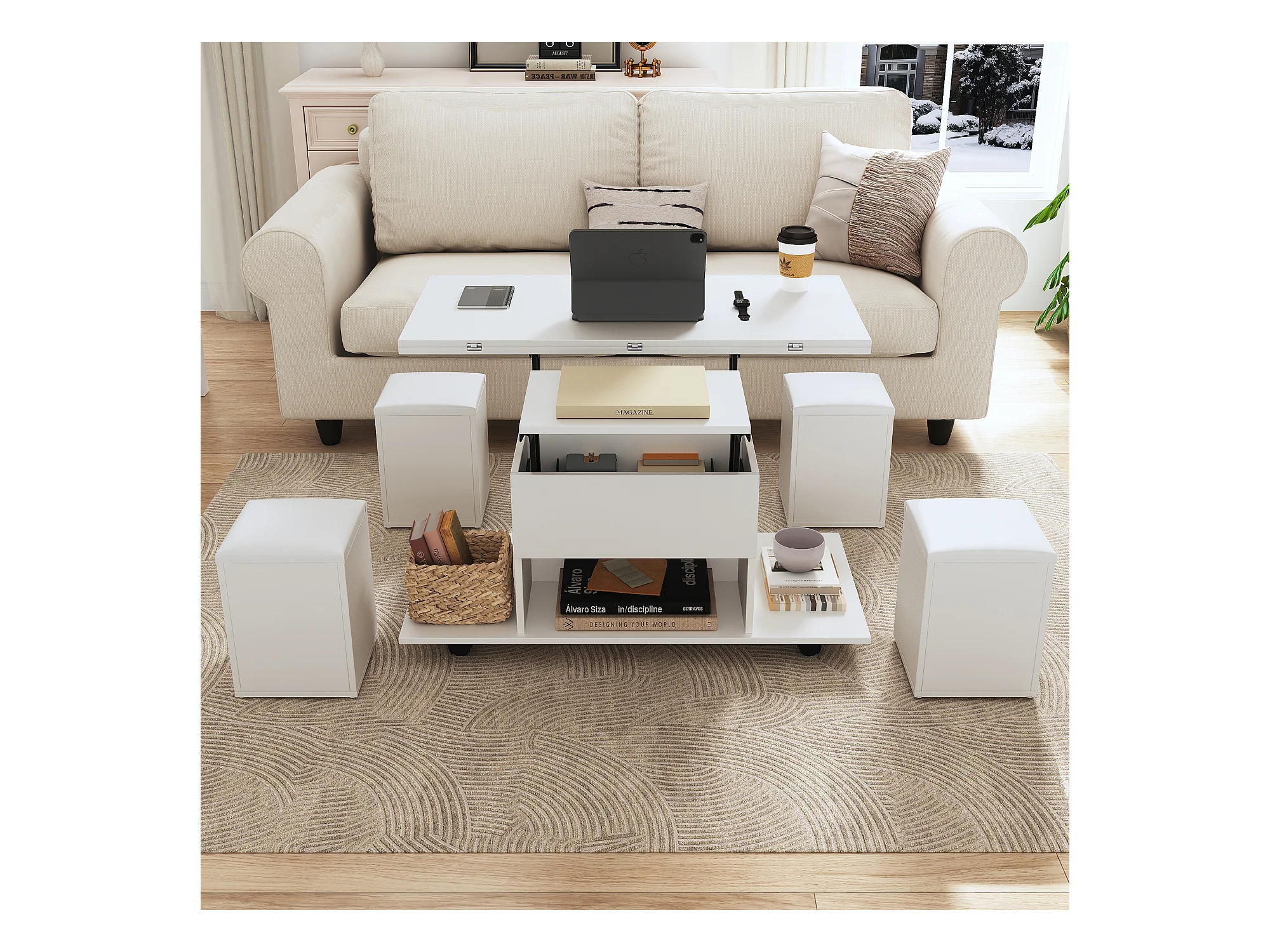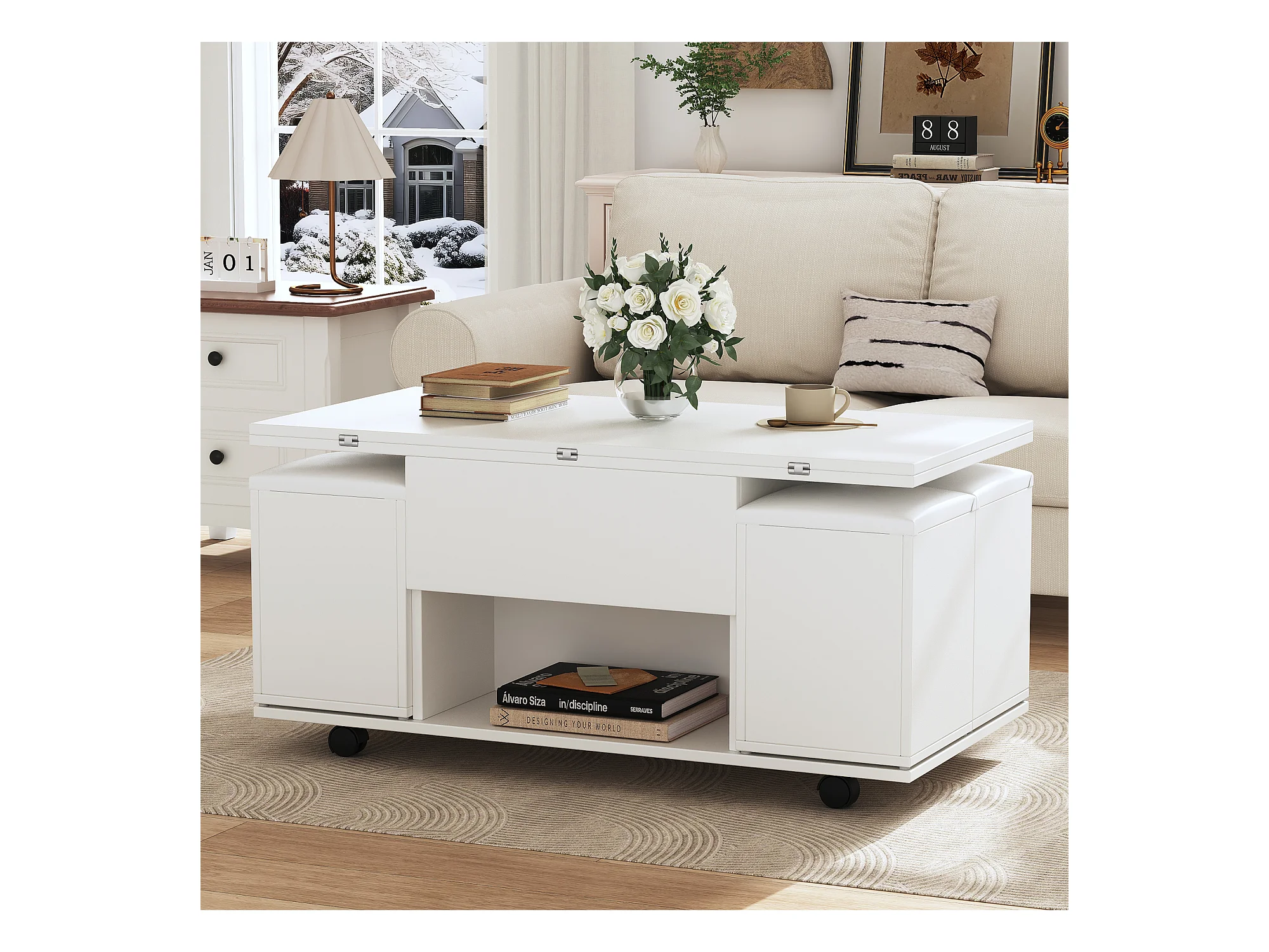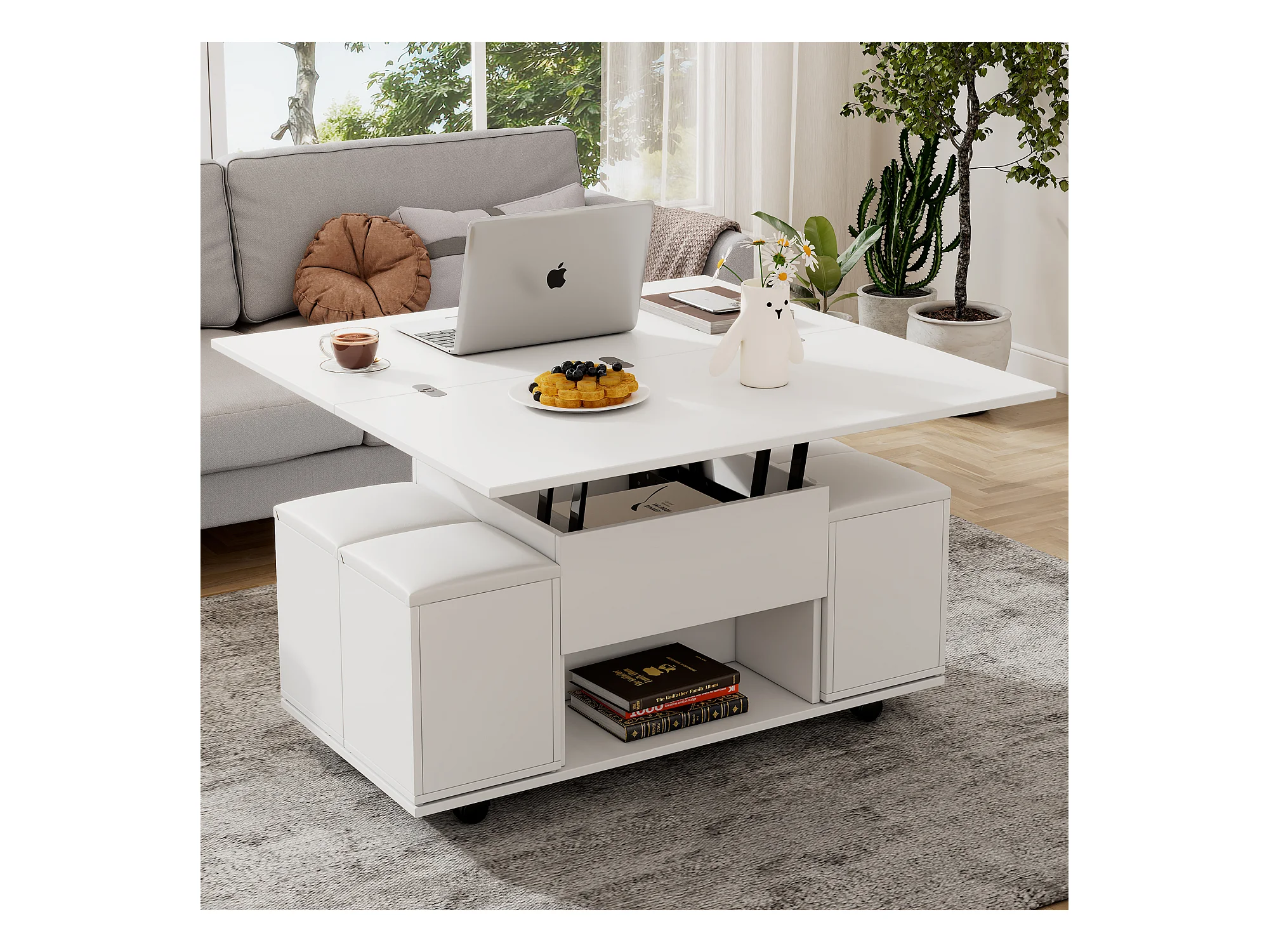 Table basse multifonction réglable en hauteur, plateau déployable en 2 tables, blanc, grande capacité, idéale pour salon, bureau ou repas.
