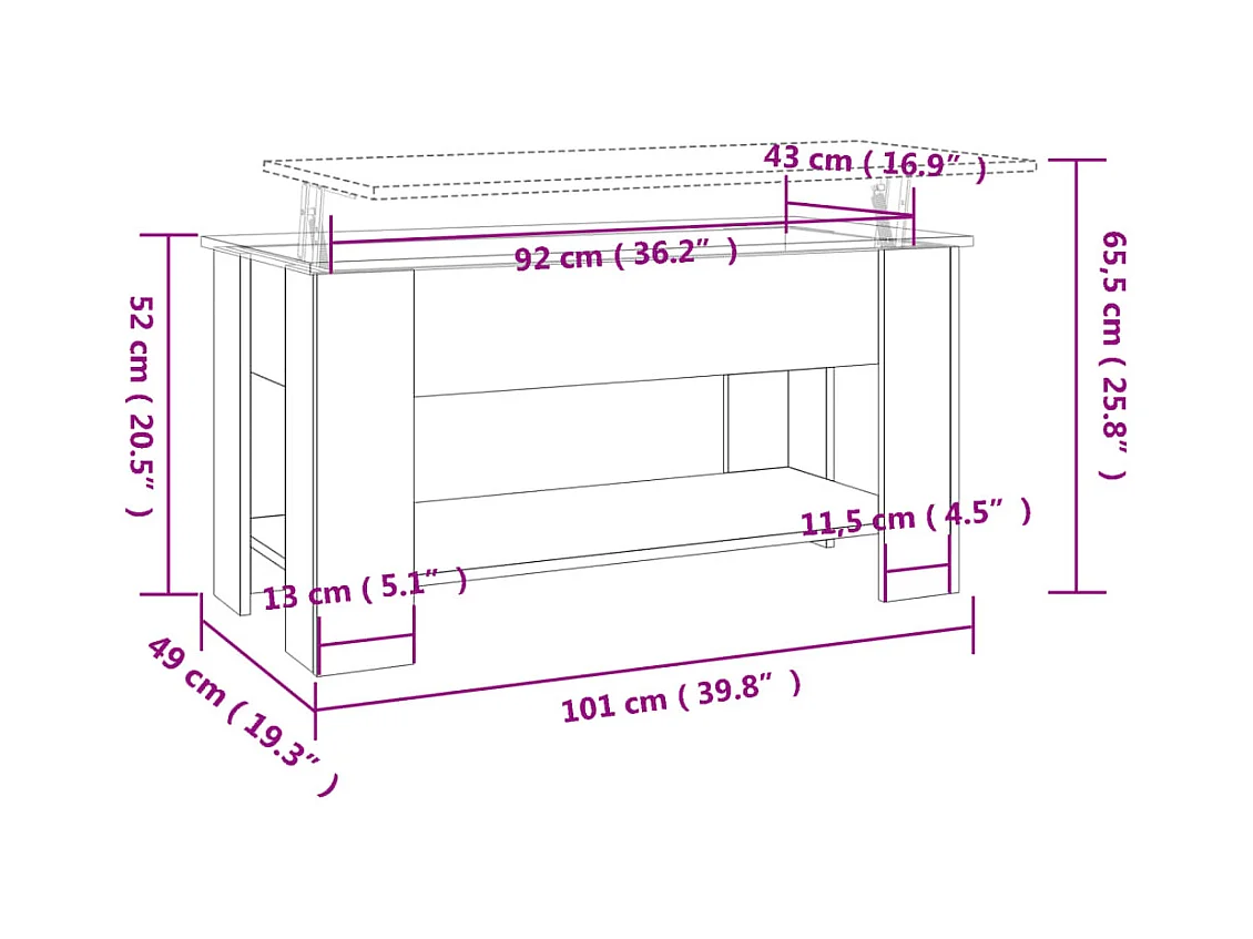 Table basse relevable - 95 x 48 x 42 cm - avec rangement dissimulé + Leds + 1 tiroir - aggloméré - noir