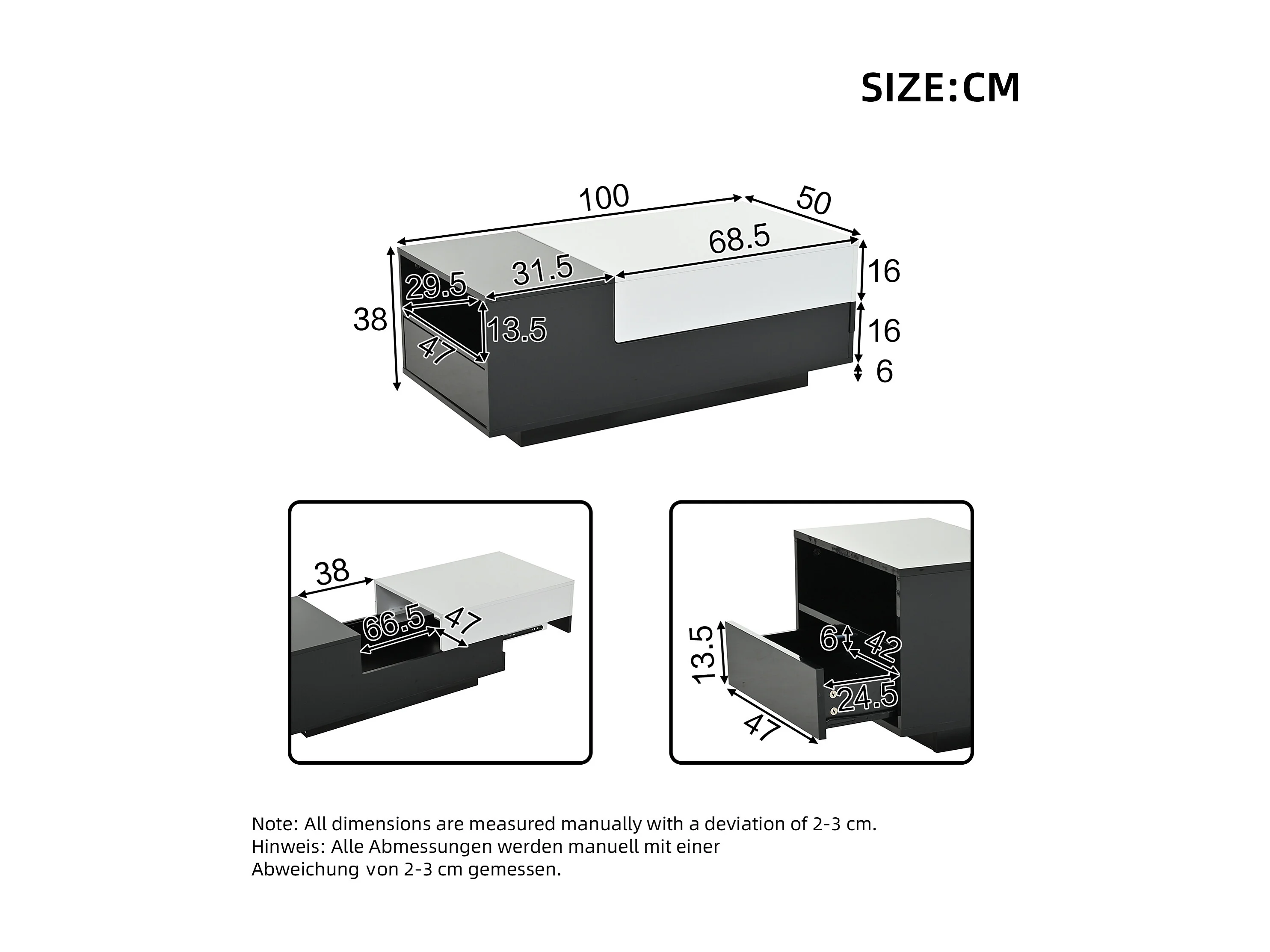 Table basse noir et blanc - Table basse avec plateau coulissant et 1 tiroir - compartiment de rangement dissimulé