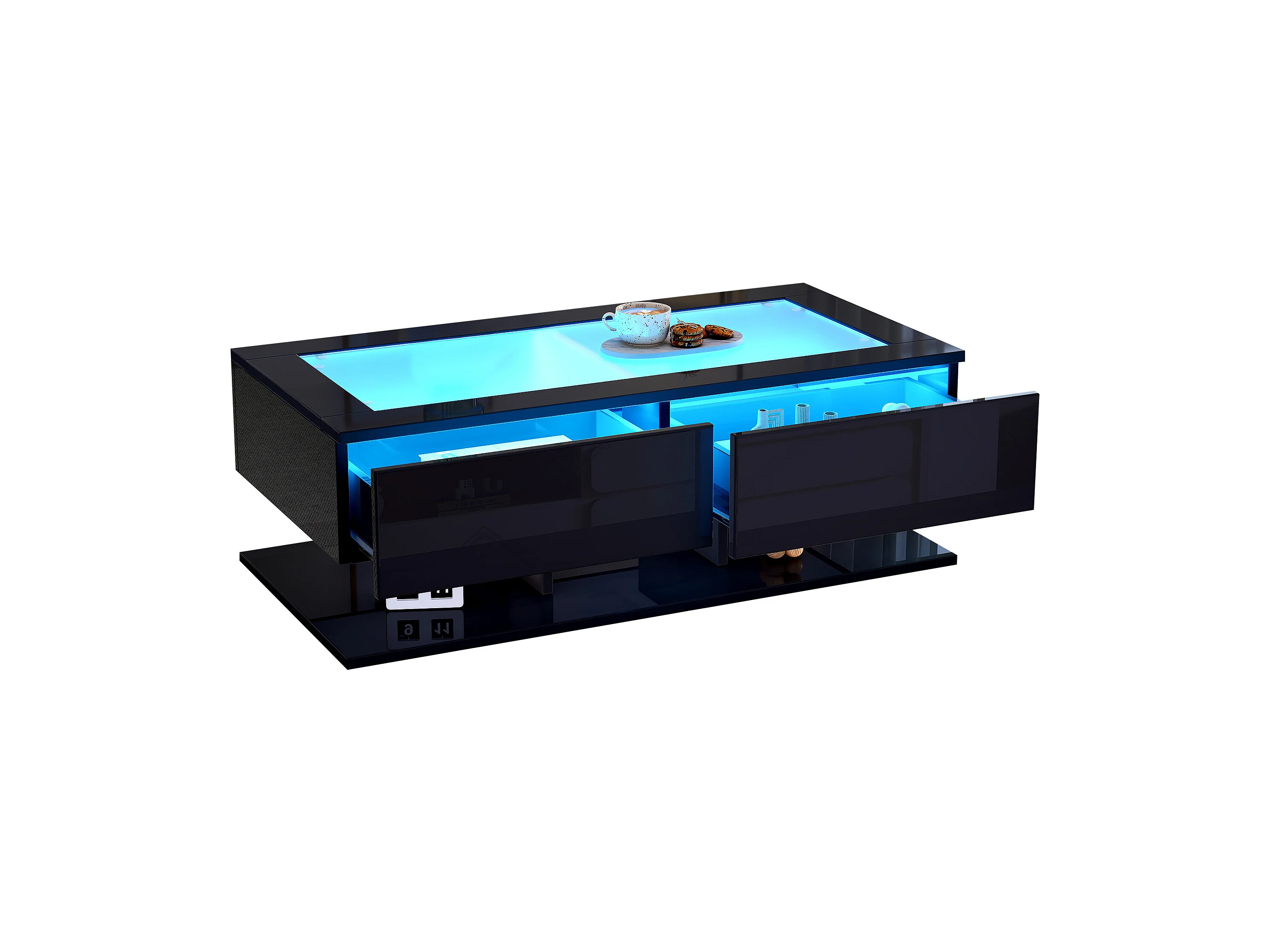 Table basse noire, table basse rectangulaire avec éclairage LED et 2 tiroirs de rangement, plateau en verre