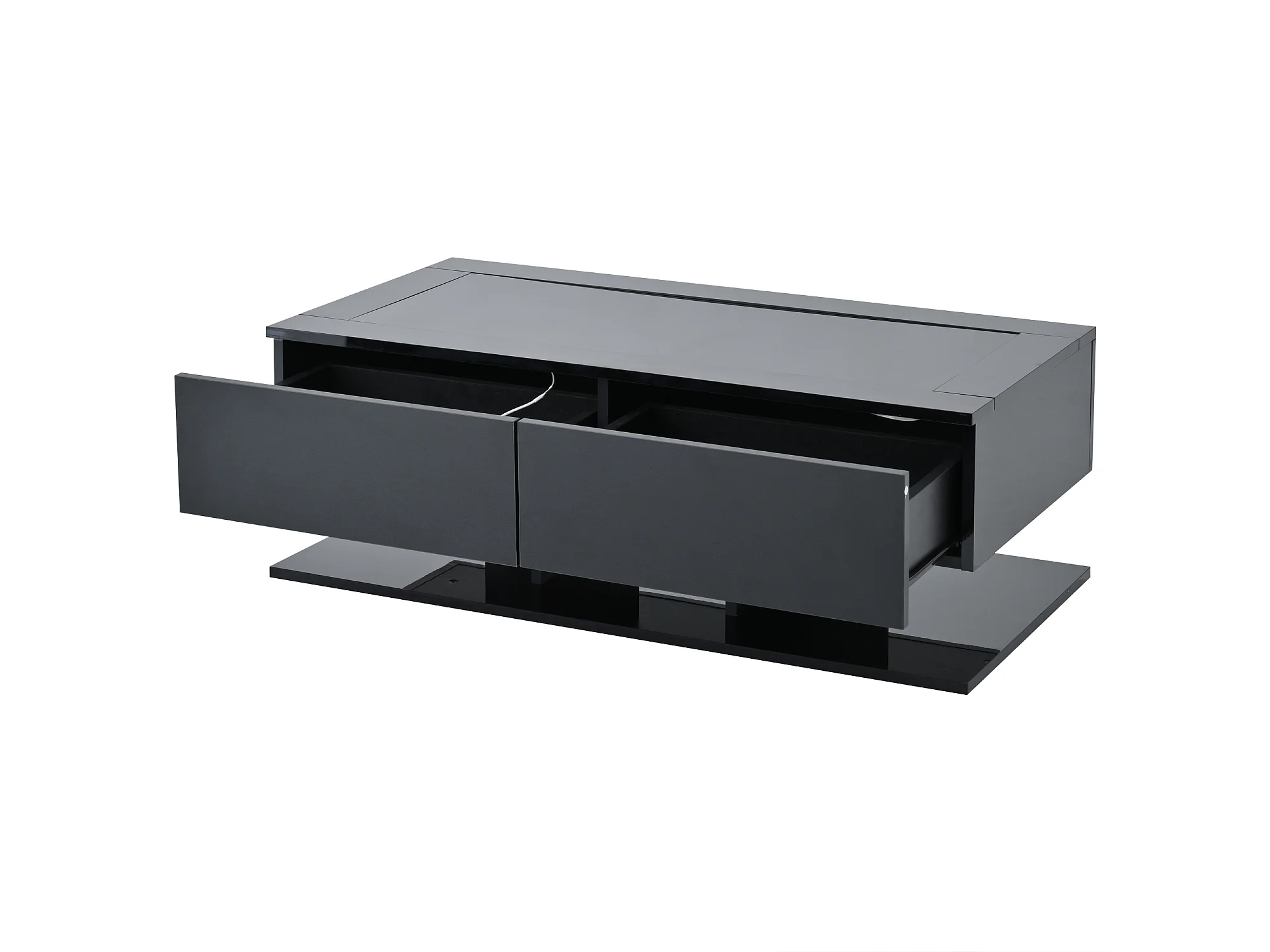 Table basse rectangle 100x50x38.5cm avec 1 tiroir et LED, Double plateau, corps en noir brillant