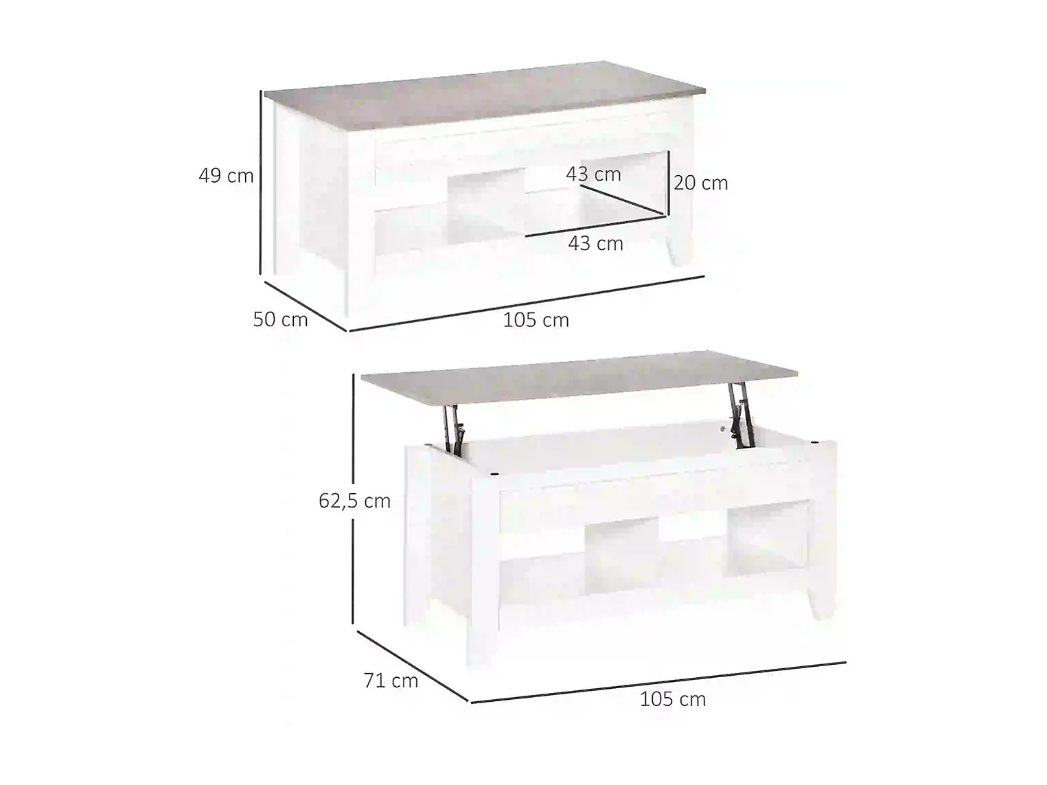 Table basse plateau relevable, table de salon avec étagères et compartiment caché,105 x 50 x 49-62,5 cm pour salon, chambre, bois blanc