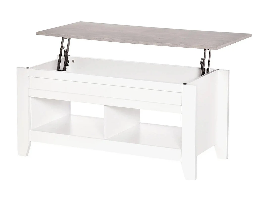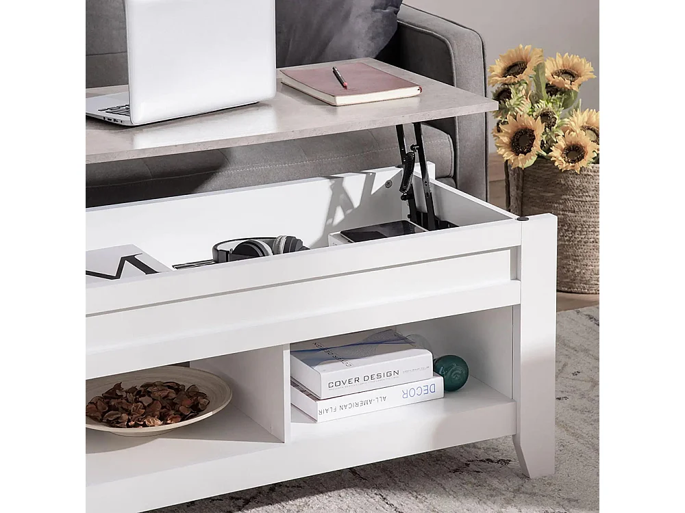 Table basse plateau relevable table de salon avec étagères et compartiment bois blanc
