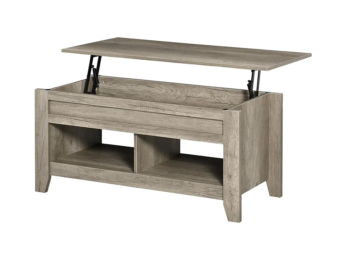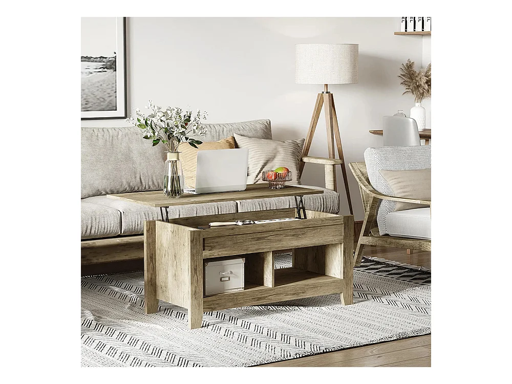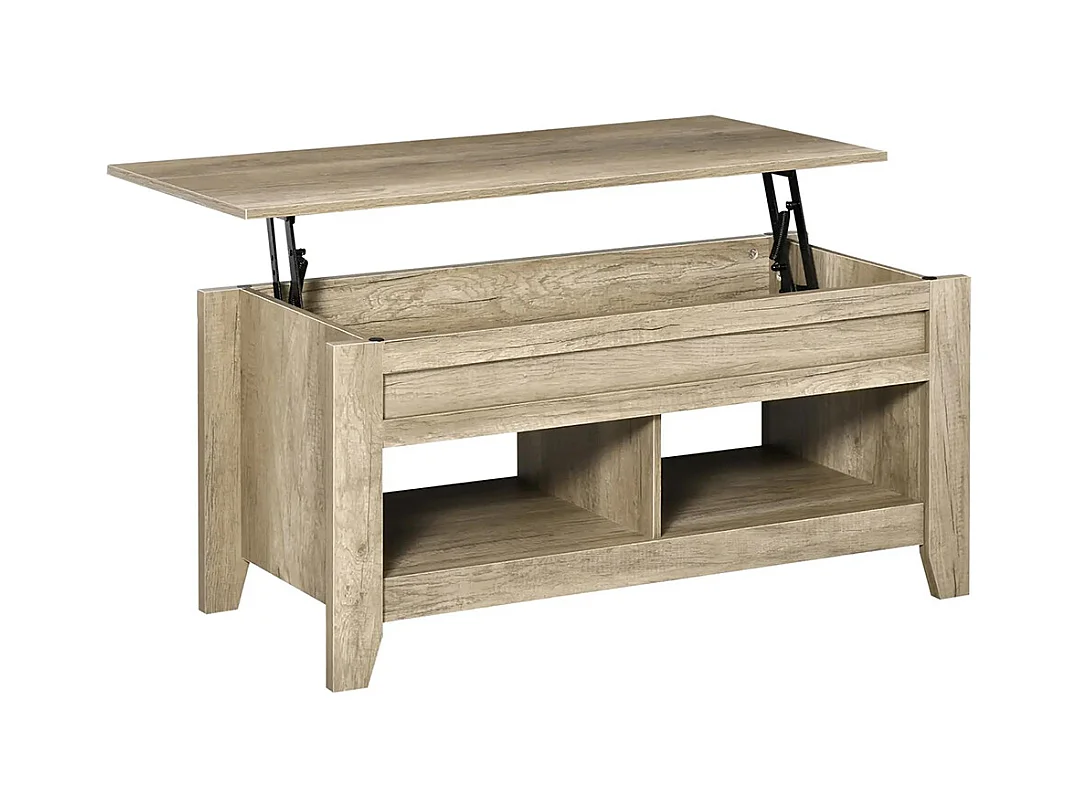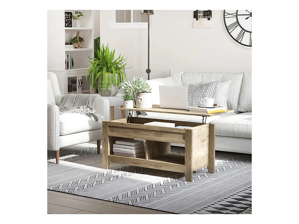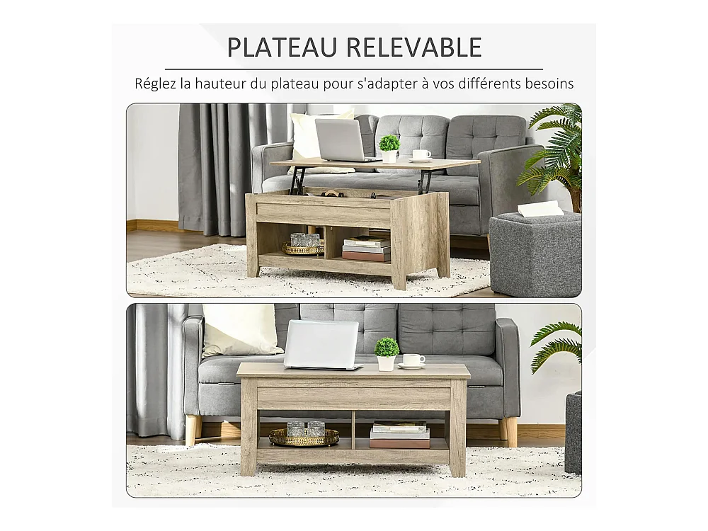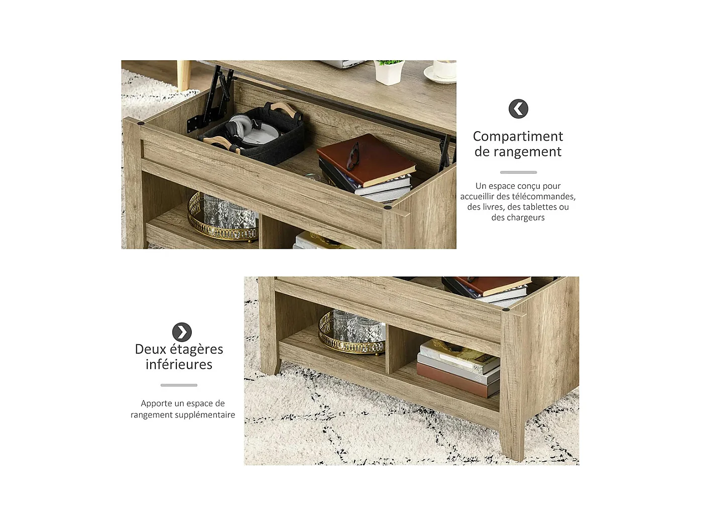 Table basse plateau relevable, table de salon avec étagères et compartiment caché,105 x 50 x 49-62,5 cm pour salon, chambre, bois chêne