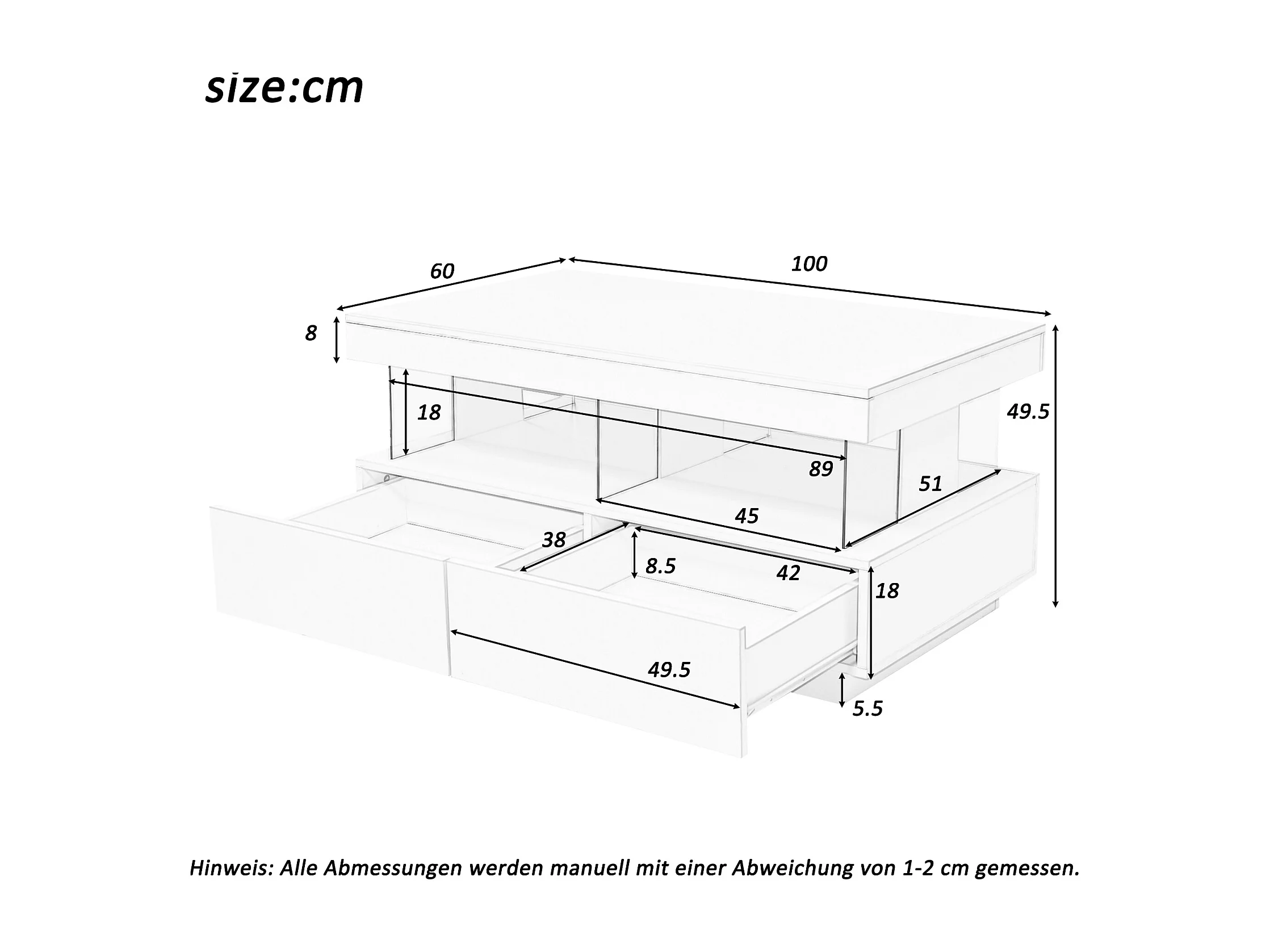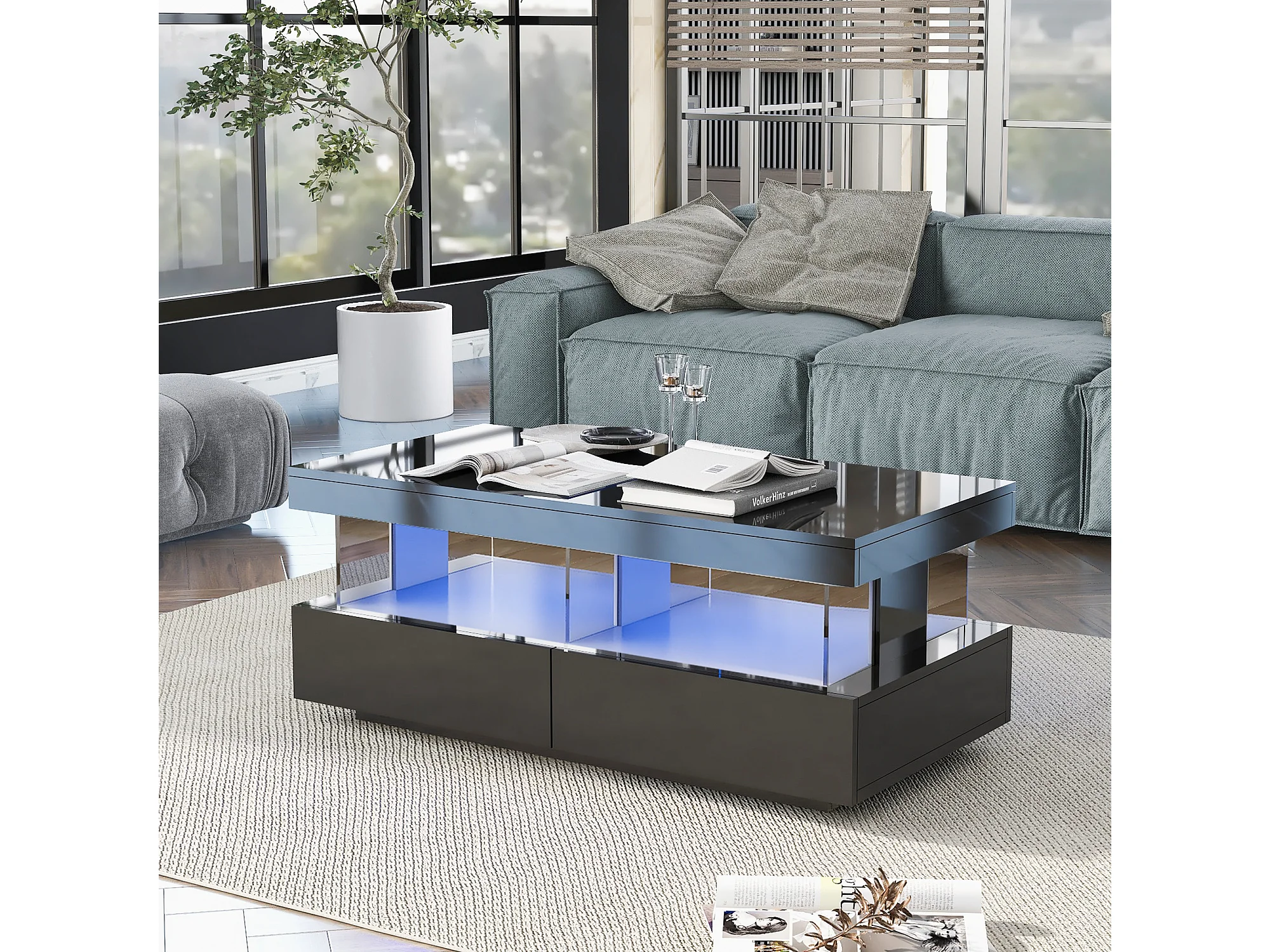 Table basse brillante avec LED, plateau extensible noir et blanc, rangement caché et bande lumineuse 16 couleurs